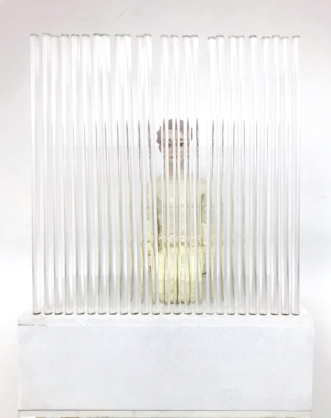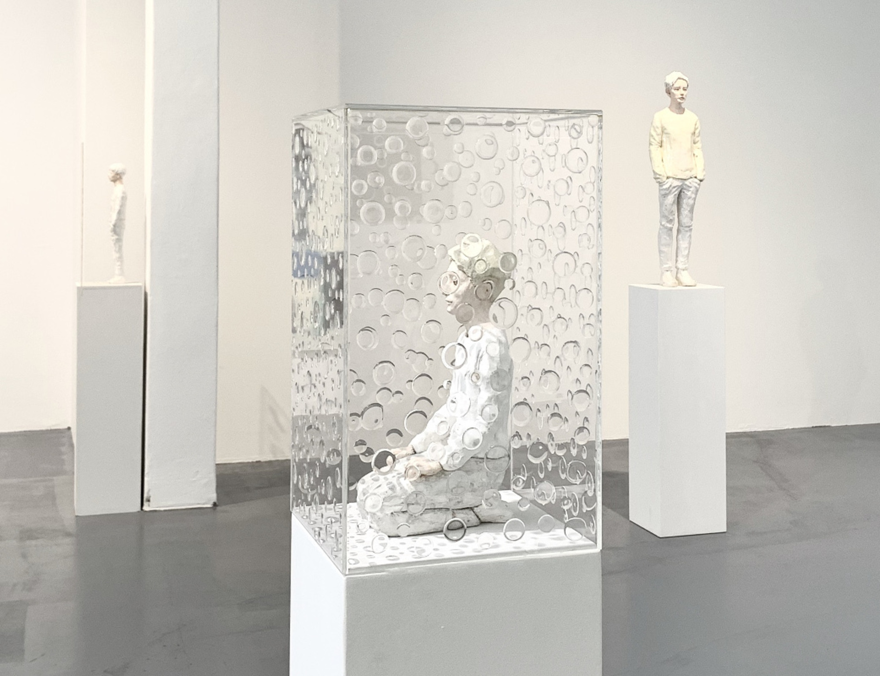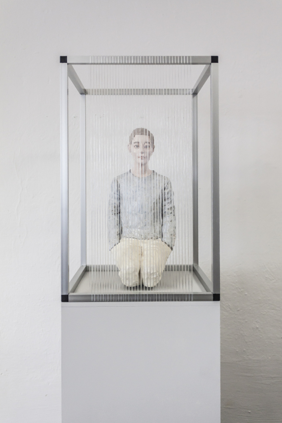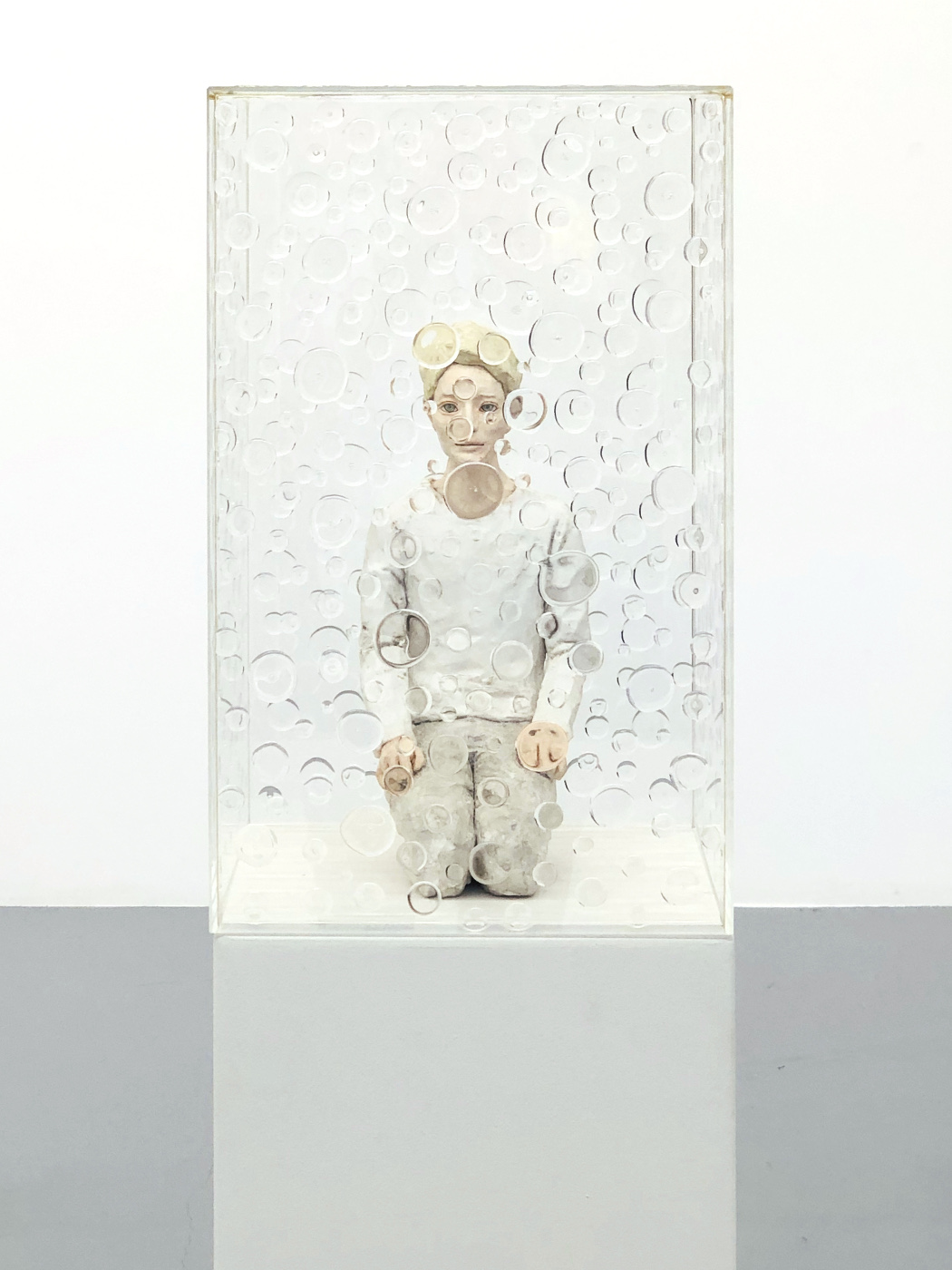 In his latest project Hirofumi Fujiwara deals with the theme "Utopia". These sculptures are not so much models of man in the future, rather he creates figures of a parallel world. In contrast to his earlier works, the sculptures in this series are united by the element of concealment. This aspect of mystery is implemented through the use of transparent walls, which are constructed around the figures like a protective wall. Only upon closer inspection can one guess the essence of each individual figure behind Plexiglas, silicone drops, or straws.