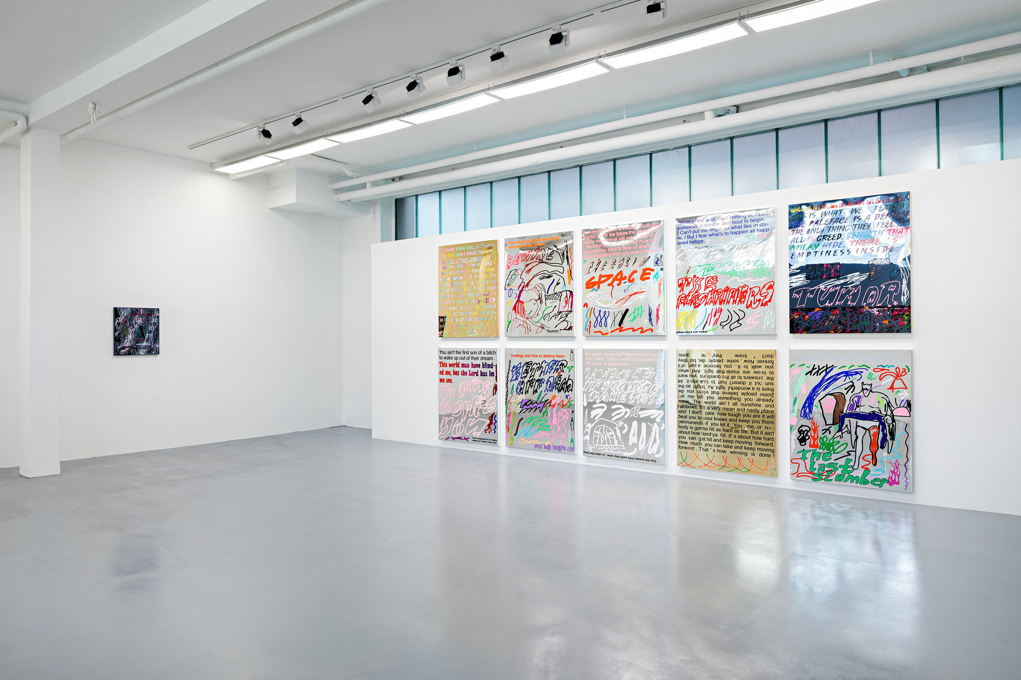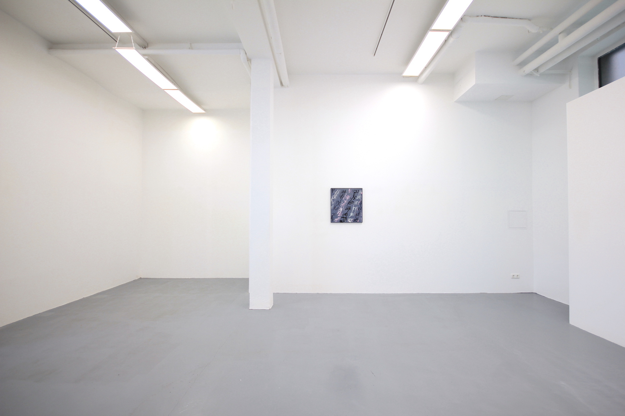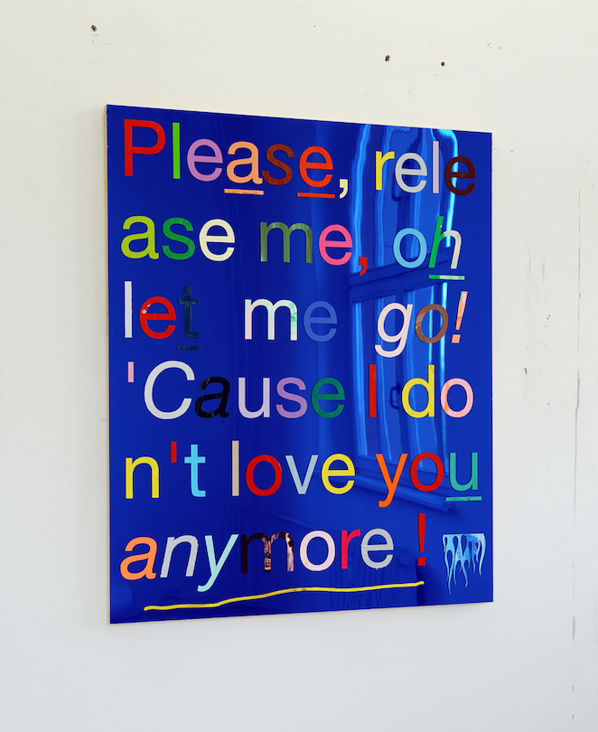 In his solo exhibition, Lukas Glinkowski deals exclusively with the mirror as a material and projection surface. A visual mash-up is presented: striking quotations from music, art history, comics, and urban space are found on the unusual image carrier. On superficial inspection, the garish colors in contrast with the smooth material might remind one of the remnants of a Berlin party night. The intense look in the mirror and at the motifs, on the other hand, confronts the viewer with himself and the questions of life, which the artist hints at in scraps of words and symbols on the reflective painting surface.
