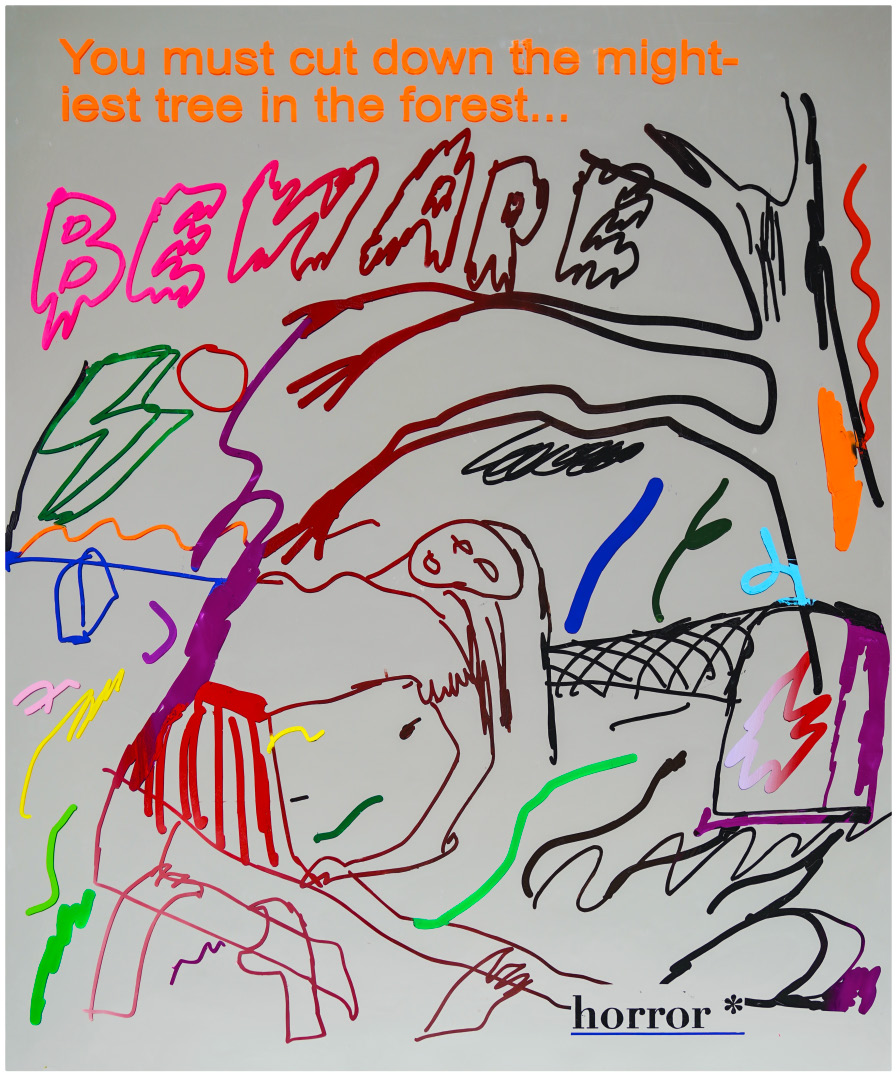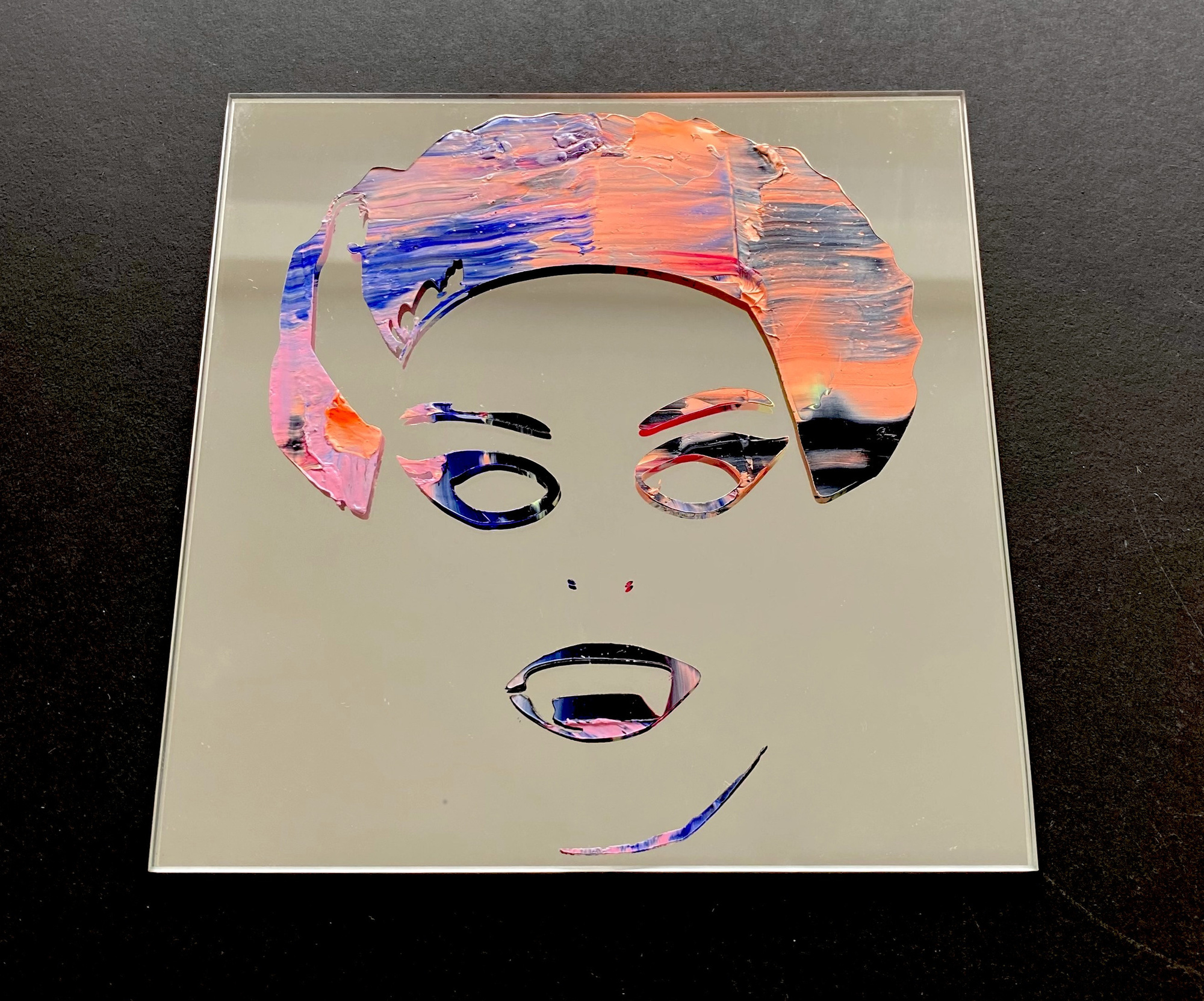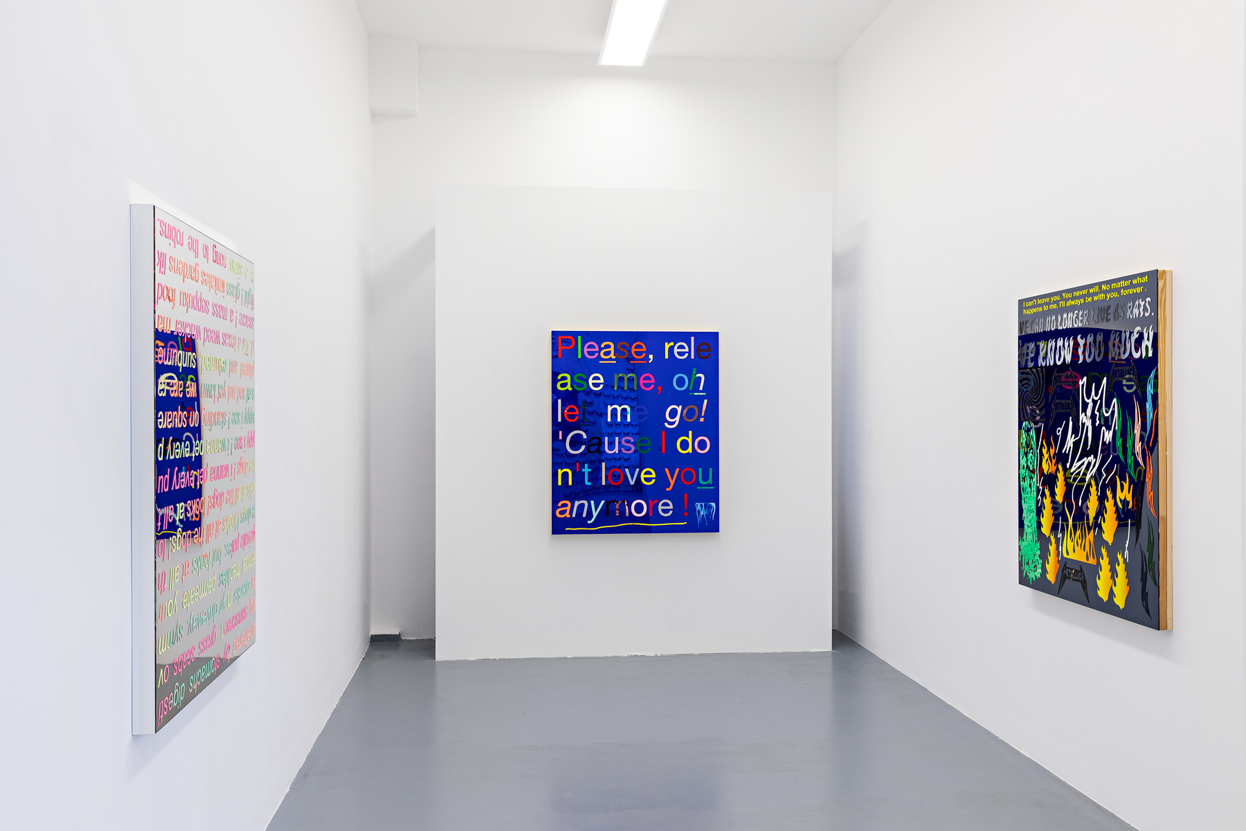 In his solo exhibition, Lukas Glinkowski deals exclusively with the mirror as a material and projection surface. A visual mash-up is presented: striking quotations from music, art history, comics, and urban space are found on the unusual image carrier. On superficial inspection, the garish colors in contrast with the smooth material might remind one of the remnants of a Berlin party night. The intense look in the mirror and at the motifs, on the other hand, confronts the viewer with himself and the questions of life, which the artist hints at in scraps of words and symbols on the reflective painting surface.