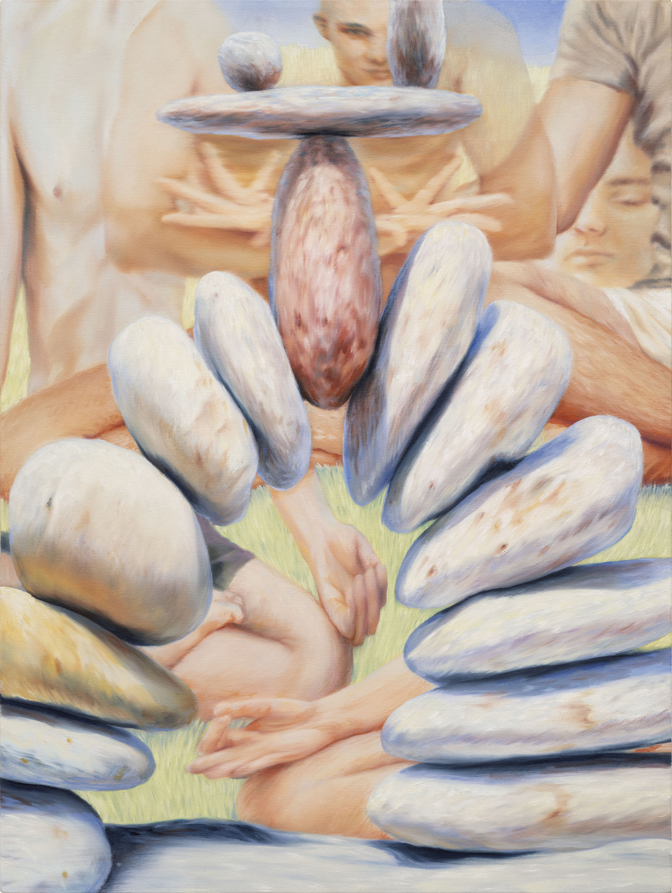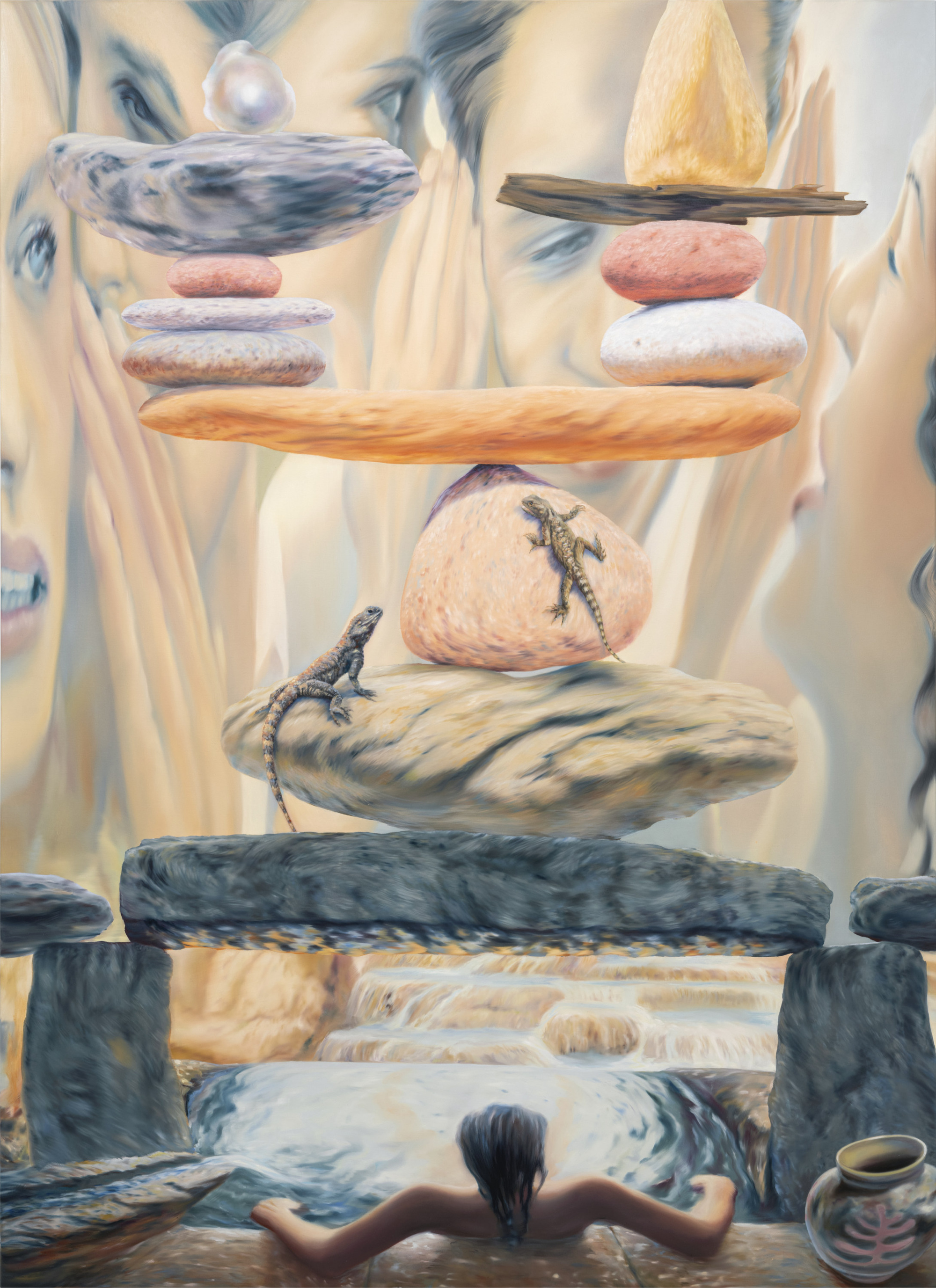 In the backgrounds: surreal constellations, traces of stories, exaggeratedly beautiful natural landscapes, Zen gardens and playful stone balustrades. However, there are eerie silhouettes, blurred and out of focus, as if liquefied in the shadows. This threat is always lurking behind Galamb Thorday's opulent, elegant motifs and yet is so easy to overlook - simply suppressed, as in “real” - in her large formats, as in the frenzy of the social media - self care - treat yourself - cosmos.