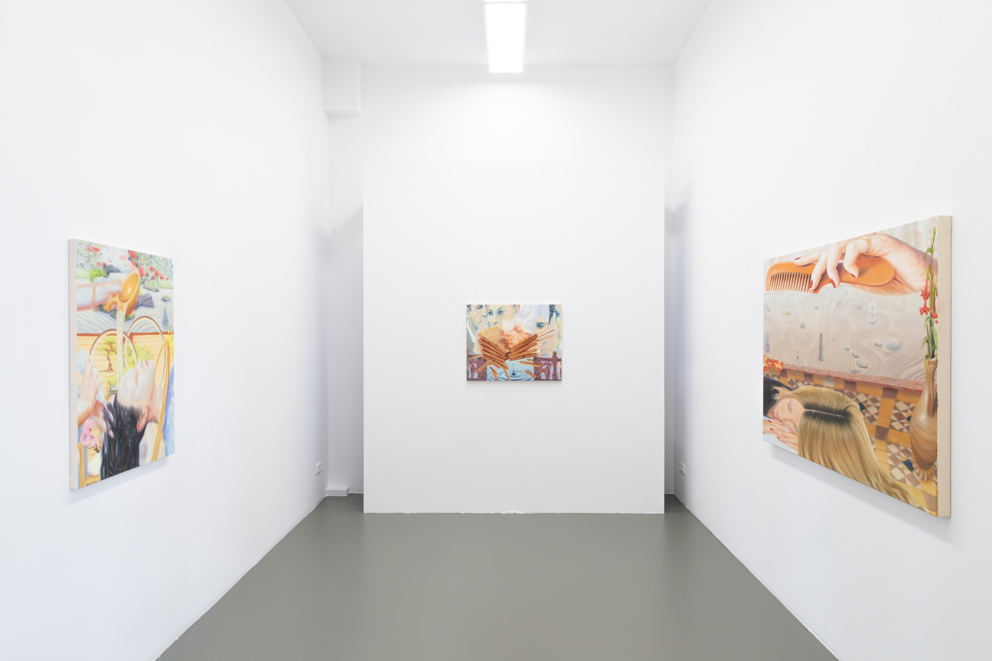 Thorday, who came into contact with the romanticization of a time that idealized the Austro-Hungarian Empire through her Hungarian roots on her father's side, already processed similar tendencies in her studies abroad in London (Brexit 2019), in which she captures the mythical, fantastic threshold and peak moments in her process of overcoming disappointment. Consider, for example, “Cum grano salis”, in which a comb pauses in a swing over a head, also reflecting the aspects of her work that playfully address problematic aspects of the flow of expectations. This allows her to take people's underlying, genuine insecurity seriously, or as she says: “To paint the fears beautifully into the pictures.”