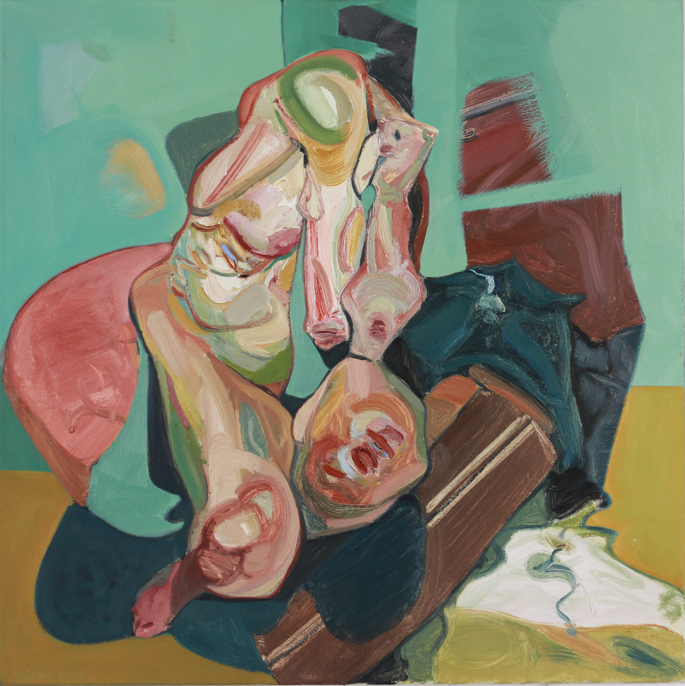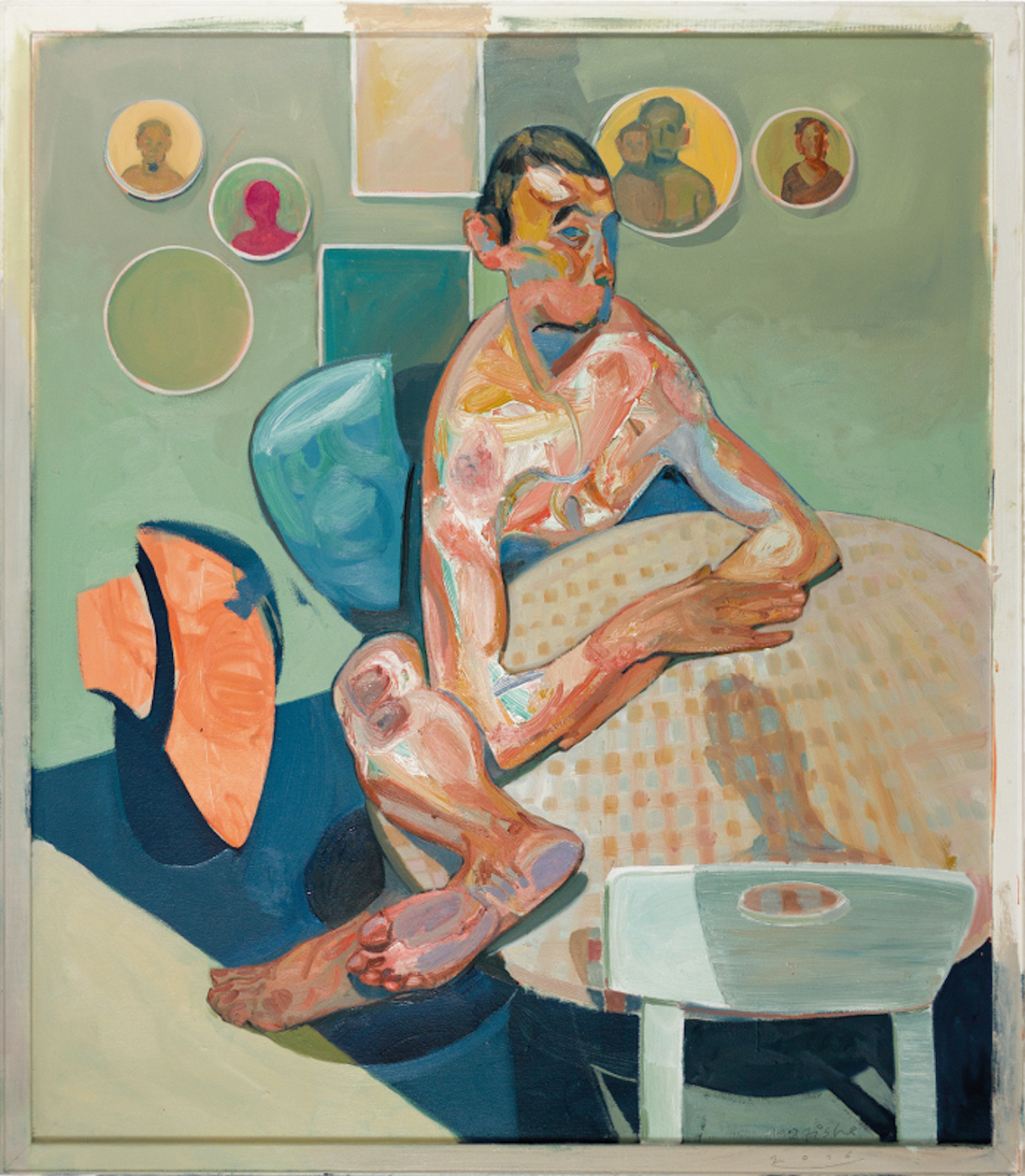 Whenever I paint, I try not to portray particular people that I know, even though they have initiated many thoughts over the course of my work. What interests me is the physical make-up of people, how they evolve regarding political and societal relationships. So people are the most important elements in my pictures. They’re a kind of language, a concept, embodied in human flesh. It is for this reason that I am also interested in their nakedness and exposure. In a certain way they uncover a part of that reality that we often hide in a stubborn, calculated, and artificial way. I take great trouble to make my figures appear as animated as possible – not in the sense of a perfect adaptation of their shell but rather like a helium balloon in human form and corresponding colour. The representation of skin is therefore also of minor importance for me.