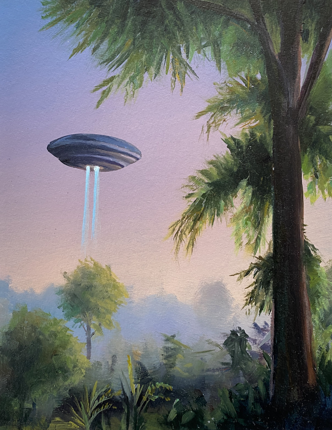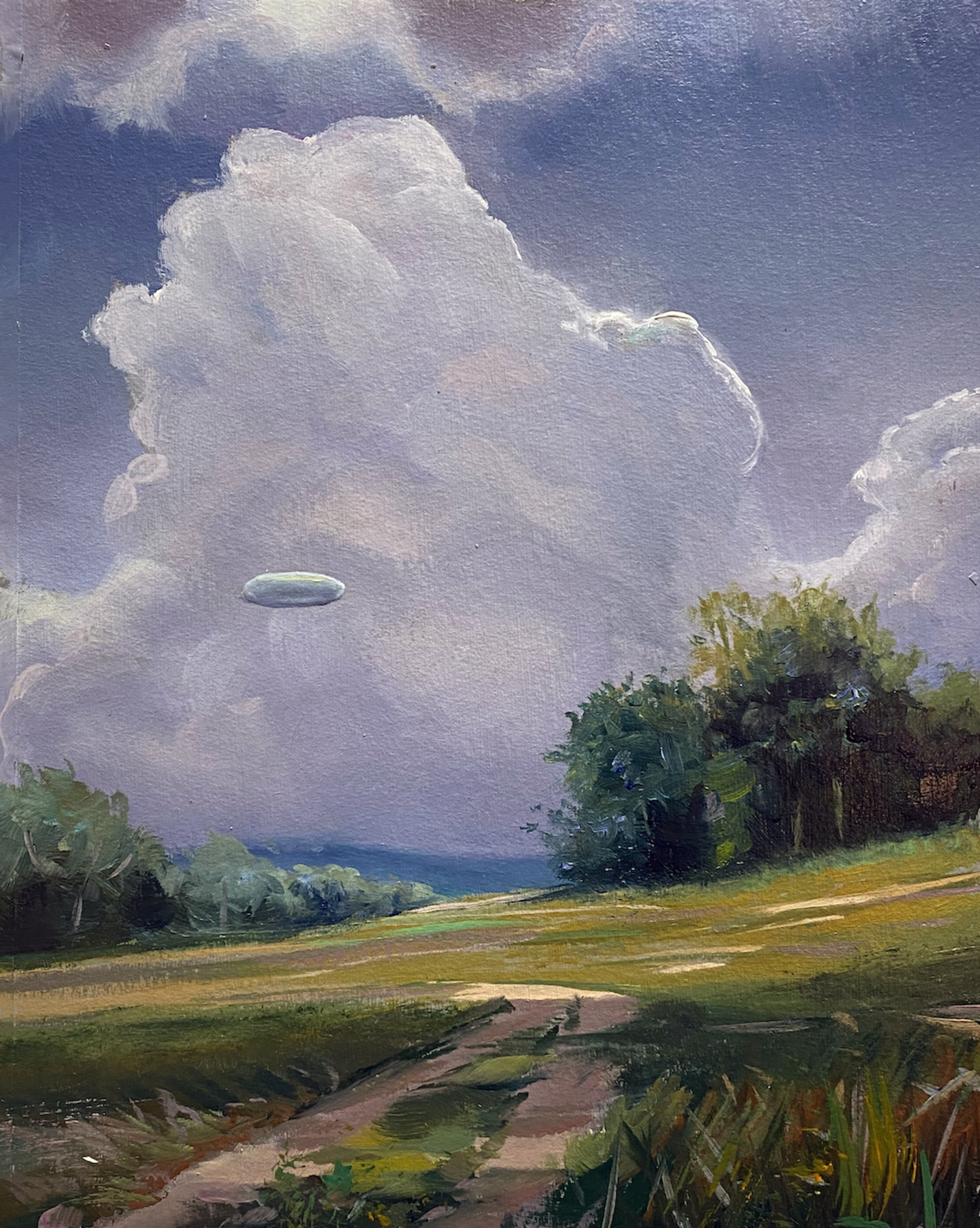 Seit Jahrzehnten sind Ufo-Sichtungen ein fester Bestandteil der Popkultur und faszinieren Menschen weltweit. Unabhängig davon, ob Abbildungen von Ufo-Sichtungen echt sind oder nicht, befeuern sie die Fantasie der Menschen und lassen uns darüber nachdenken, ob wir allein sind im Universum. Gerade in Zeiten von Verschwörungsmythen und Fake-News kann die Ufo-Sichtung als Klassiker unter eben jenen Narrativen gelten, die auf dem schmalen Grat zwischen Wissenschaft und Glauben balancieren. In seiner Serie I want to believe spürt Kersting diesem popkulturellen Phänomen nach, indem er den eigentlich fotografischen Abbildungen der Ufos ihren Nimbus als Beweisstück nimmt und Sie in Malerei übersetzt. So wird der Augenmerk auf ihren ästhetischen Gehalt als Landschaftsbild mit postmodern-ironischem Unterton gelegt.