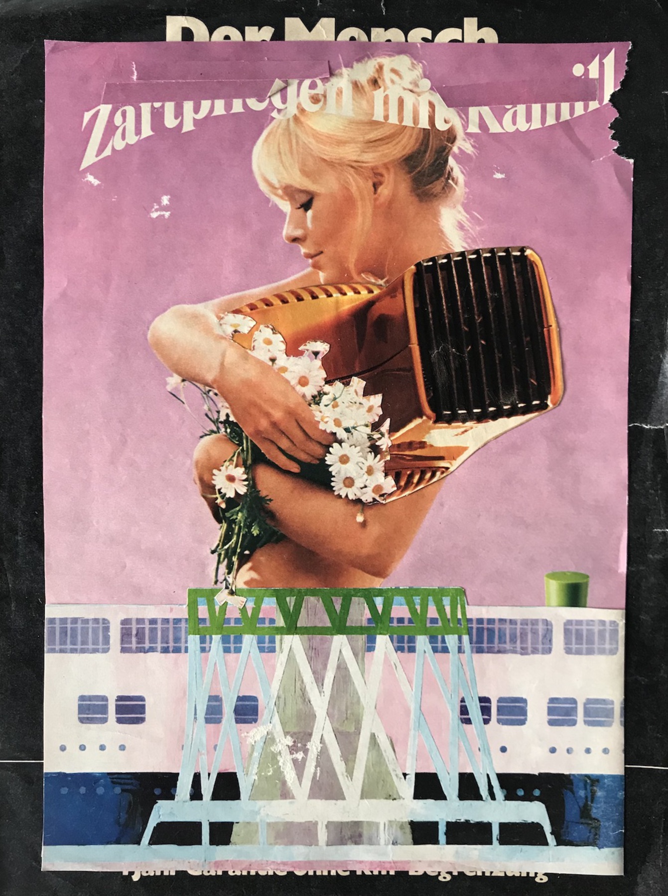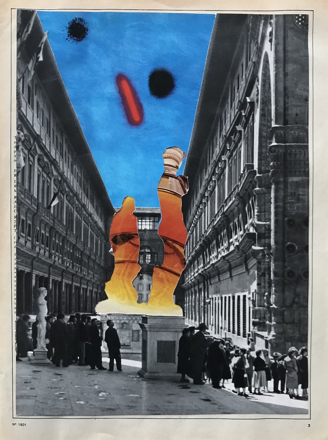 Gefundenes, Gesammeltes, Altes und Neues ergeben wichtige Ausgangsmaterialien für den Künstler Michael Peltzer. Seine Collagen sind eigenständig, bieten aber auch immer wieder auch Ansätze für seine Malerei. Zusammengesetzt aus gesammelten Zeitschriften, Tageszeitungen, Bildbänden, Postkarten oder Kopien, entstehen neue Welten, die als Bildmotiv oder Idee oft weiterverarbeitet werden können. (Gisbert Danberg)