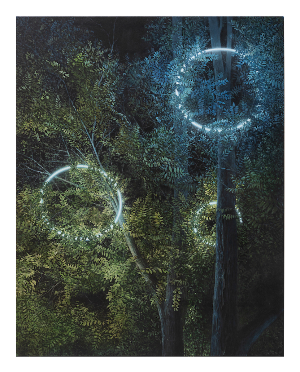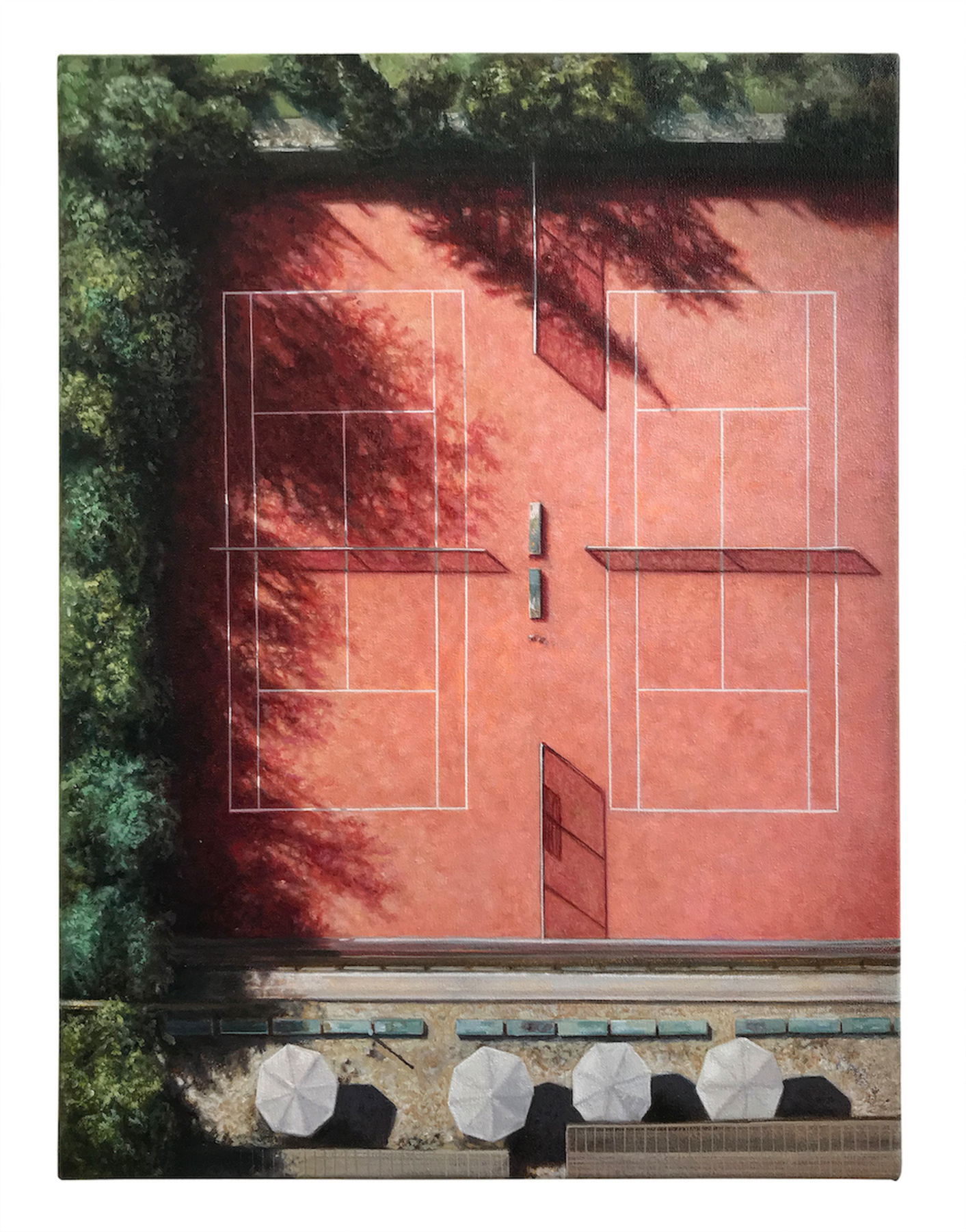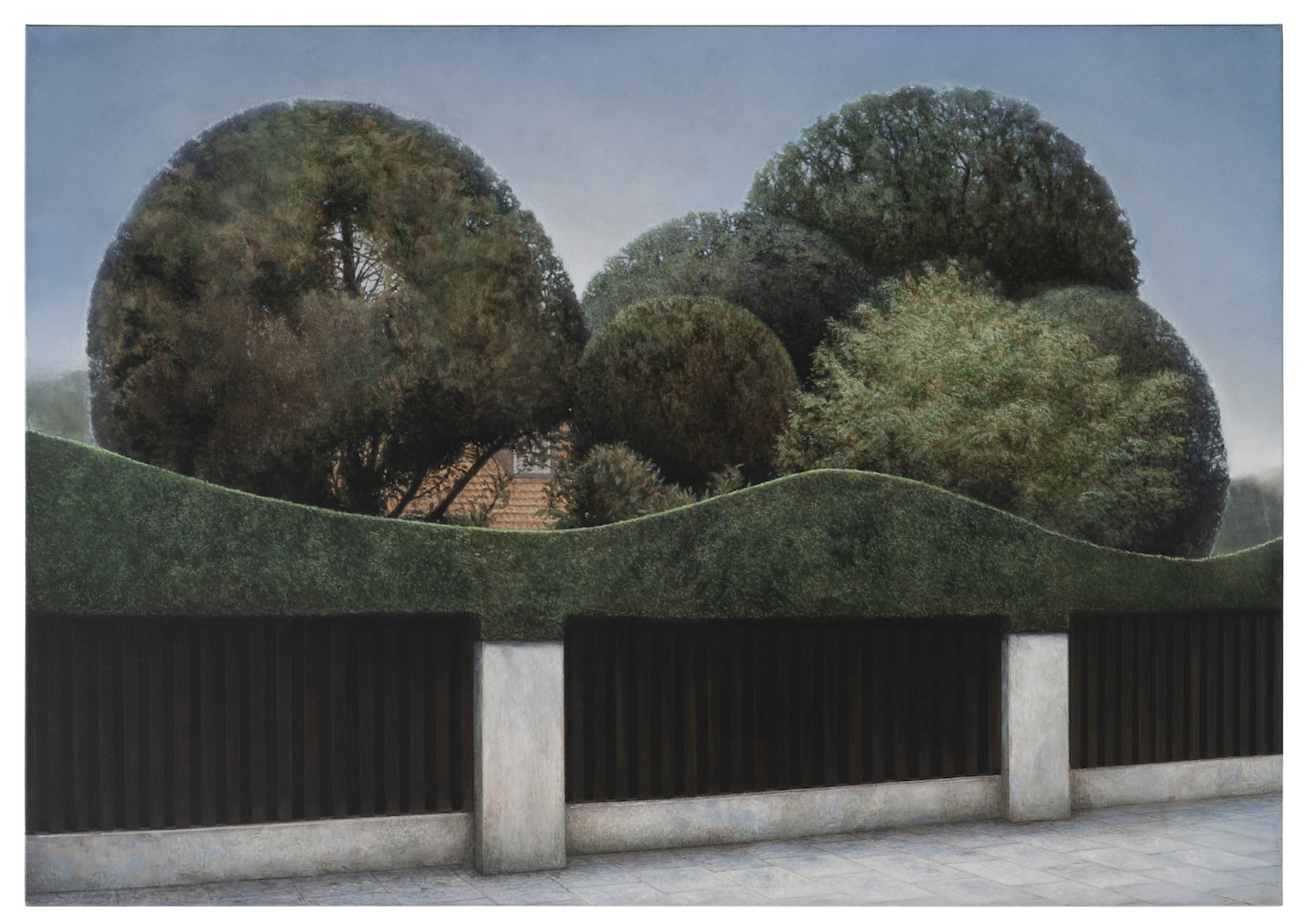 Dieses Potential der Malerei, alternative Blickwinkel auf die Welt anzubieten, zieht sich durch das Schaffen der Künstlerin. Dennoch nimmt der in Bremervörde entstandene Werkzyklus eine Sonderstellung im Gesamtwerk ein. Wo in den Grenzräumen moderner Landschaftsmalerei sonst Urbanität und Natur in einer Kollision aufeinandertreffen und letztere sich den Stadtraum zurückzuerobern scheint, herrscht in dieser neuen Serie stille Übereinkunft. Das Wechselspiel von Natürlichem und Artifiziellem, von Ursprünglichem und von Menschenhand Geschaffenem hat sich hier zu einem Miteinander entwickelt. In der Kleinstadt, so scheint es, gelten andere Regeln als in den großstädtischen Metropolen. Kleine Momente sind es jedoch auch in den für die Künstlerin typischen Sujets wie überwucherte Tore, Hecken deren Wurzeln das Straßenpflaster aufbrechen, der Blick durch einen gitterartigen Strommast auf die dahinterstehenden Bäume oder Tennisplätze aus der Vogelperspektive, an deren Rändern das Grün sich neugierig über den roten Sand beugt. Betrachten wir die Bilder als eine große Erzählung, die sich über mehrere Schaffensjahre erstreckt, dann wird deutlich, dass selbst die Arbeiten, in welchen die Künstlerin auf offensichtliche menschliche Spuren verzichtet, letztlich urbane Landschaften sind. Der Wald ist stets ein Forst, fein säuberlich in Reihe gepflanzt, und auch die Äcker sind vom Menschen geformt. So gehen wir unweigerlich davon aus, dass der Mensch nicht weit sein kann und müssen doch feststellen, dass er im Kosmos der Künstlerin nicht physisch anwesend ist.