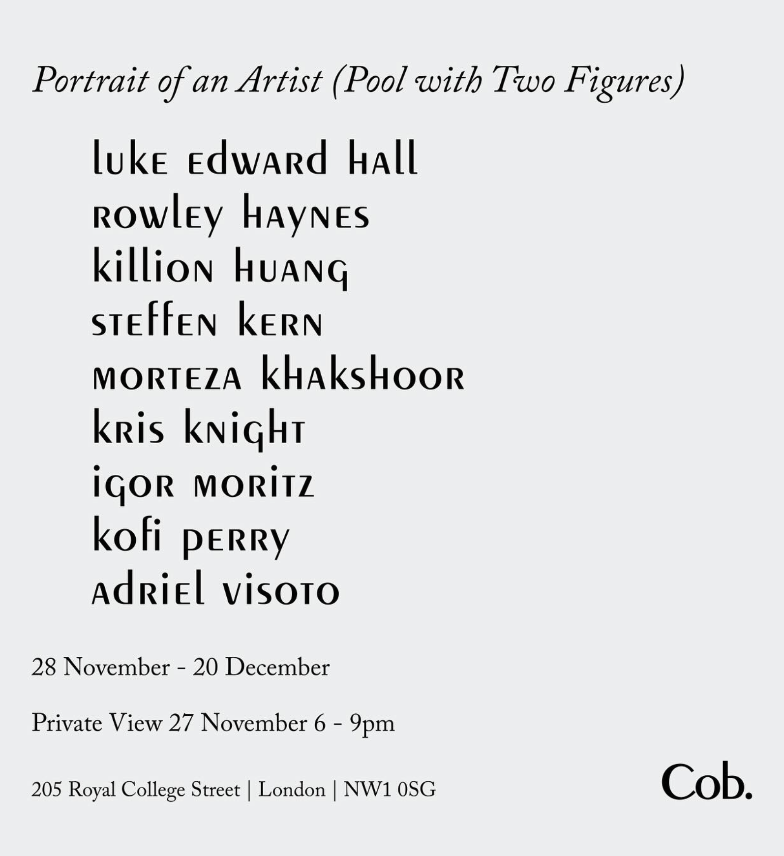 Teilnehmende Künstler:innen: Luke Edward Hall, Rowley Haynes, Killion Huang, Steffen Kern, Morteza Khakshoor, Kris Knight, Igor Moritz, Kofi Perry, Adriel Visoto
