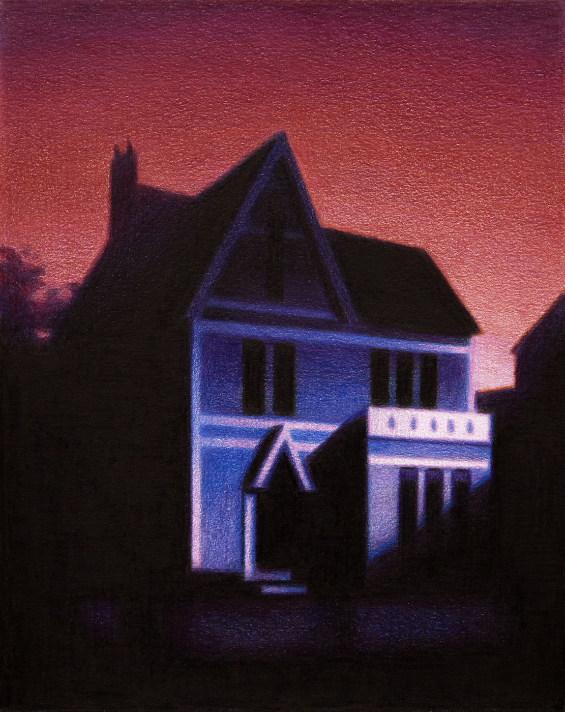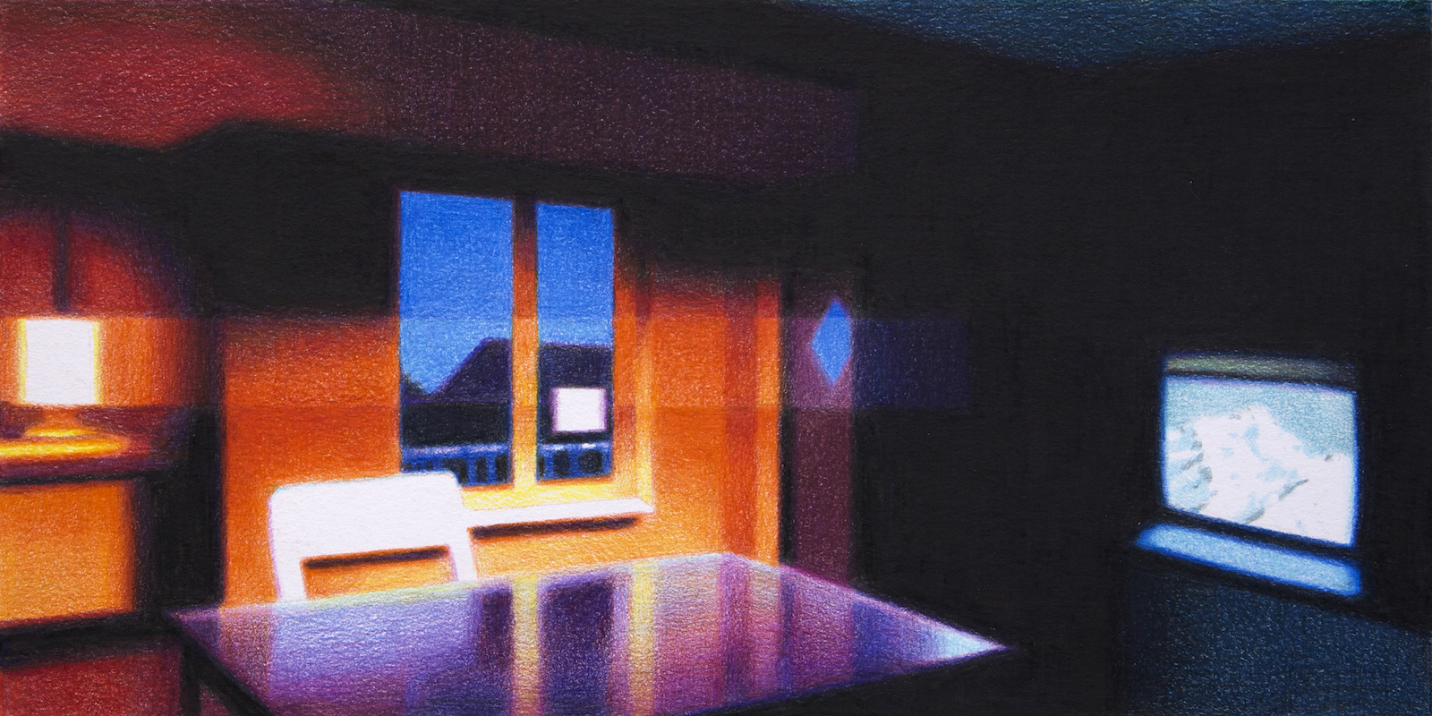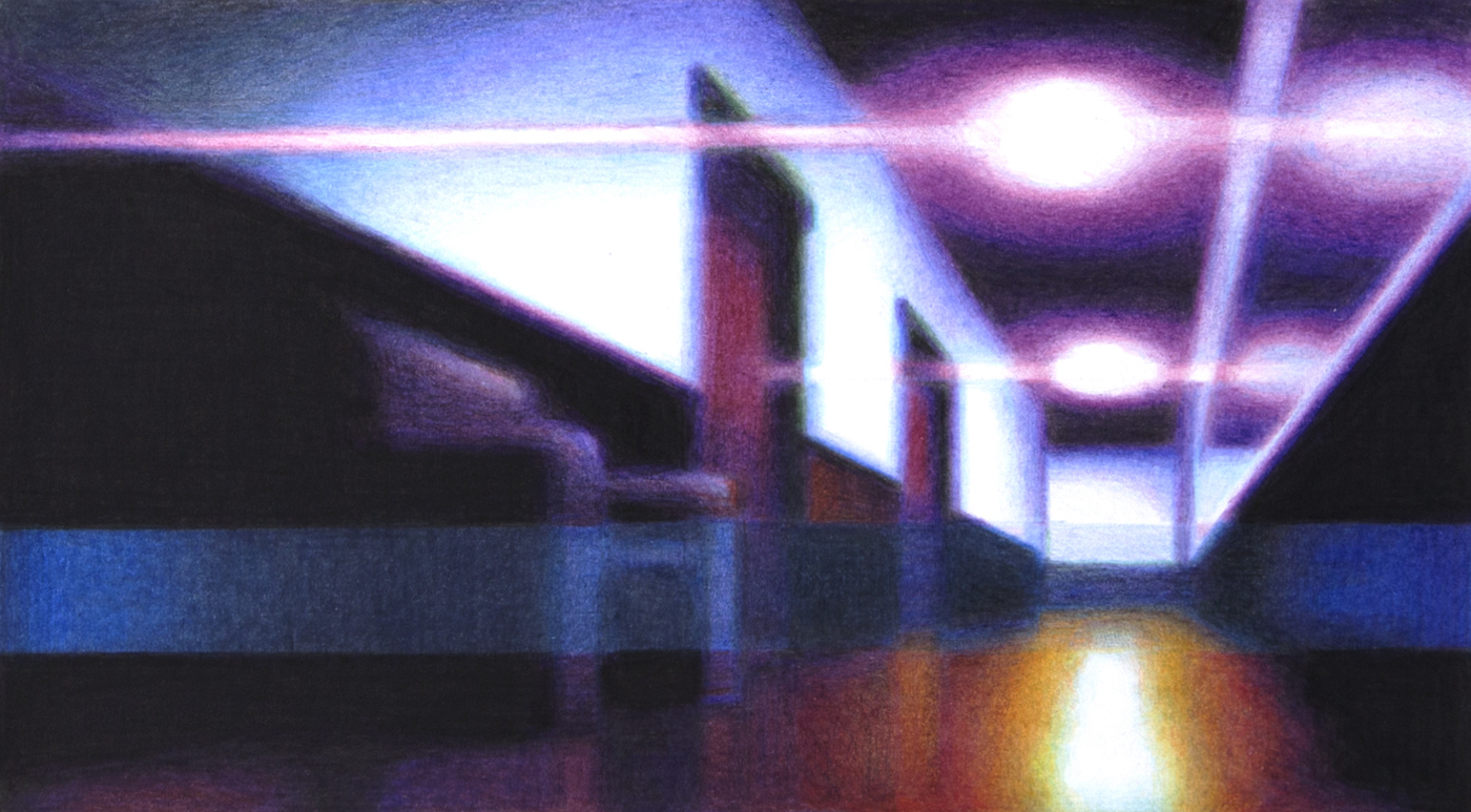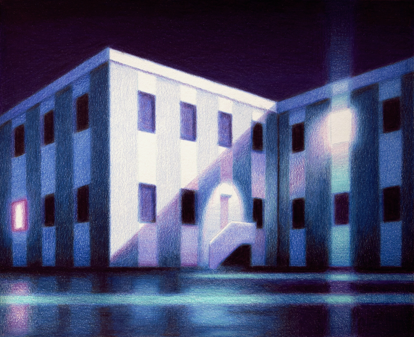 Spaces in the light of night and twilight, deserted, enigmatic, mysterious. You think you know them, these places, and yet they are not part of the usual and everyday. - They are perfect. Without traces of use and without the imprint of time, they become models, prototypes of our imaginary cosmos. The collective memory of the Western world, its dream of efficiency and flawlessness constitute the pictorial treasure that Steffen Kern's art reflects. "The image and film production of the 1950s and 1960s played a key role in the post-war TV media revolution. The equipping of most Western households with television sets meant that many people were confronted with very similar or the same images, ushering in a globalization of images," he says, which also explains why his paintings do not take photographs as their point of departure - or at least not directly. The flood of ever-similar images that we encounter every day in films and photographs are only the last reflection of basic models that are sanded down and aligned with each other through this constant repetition.
