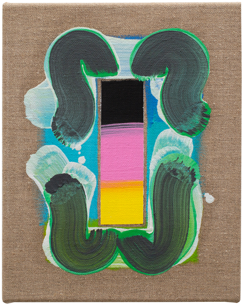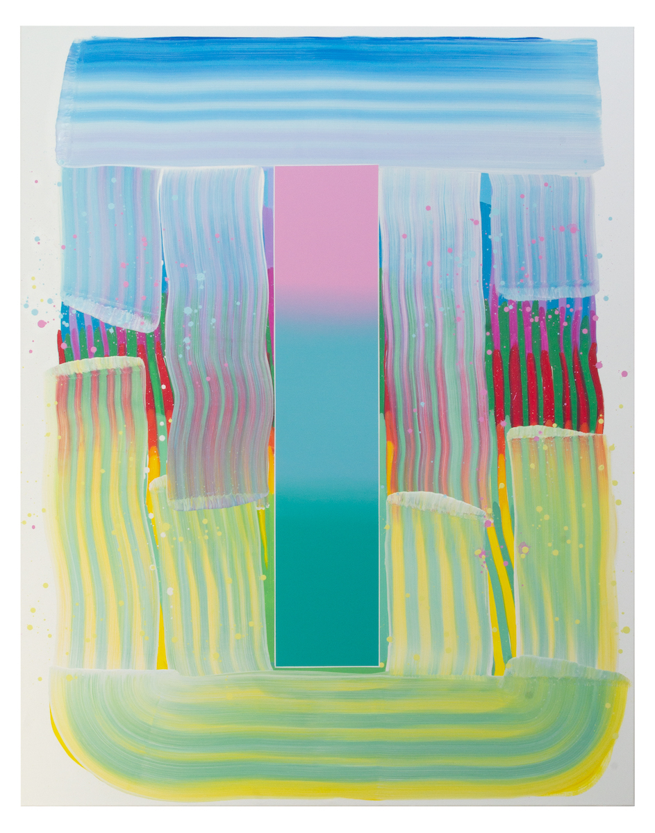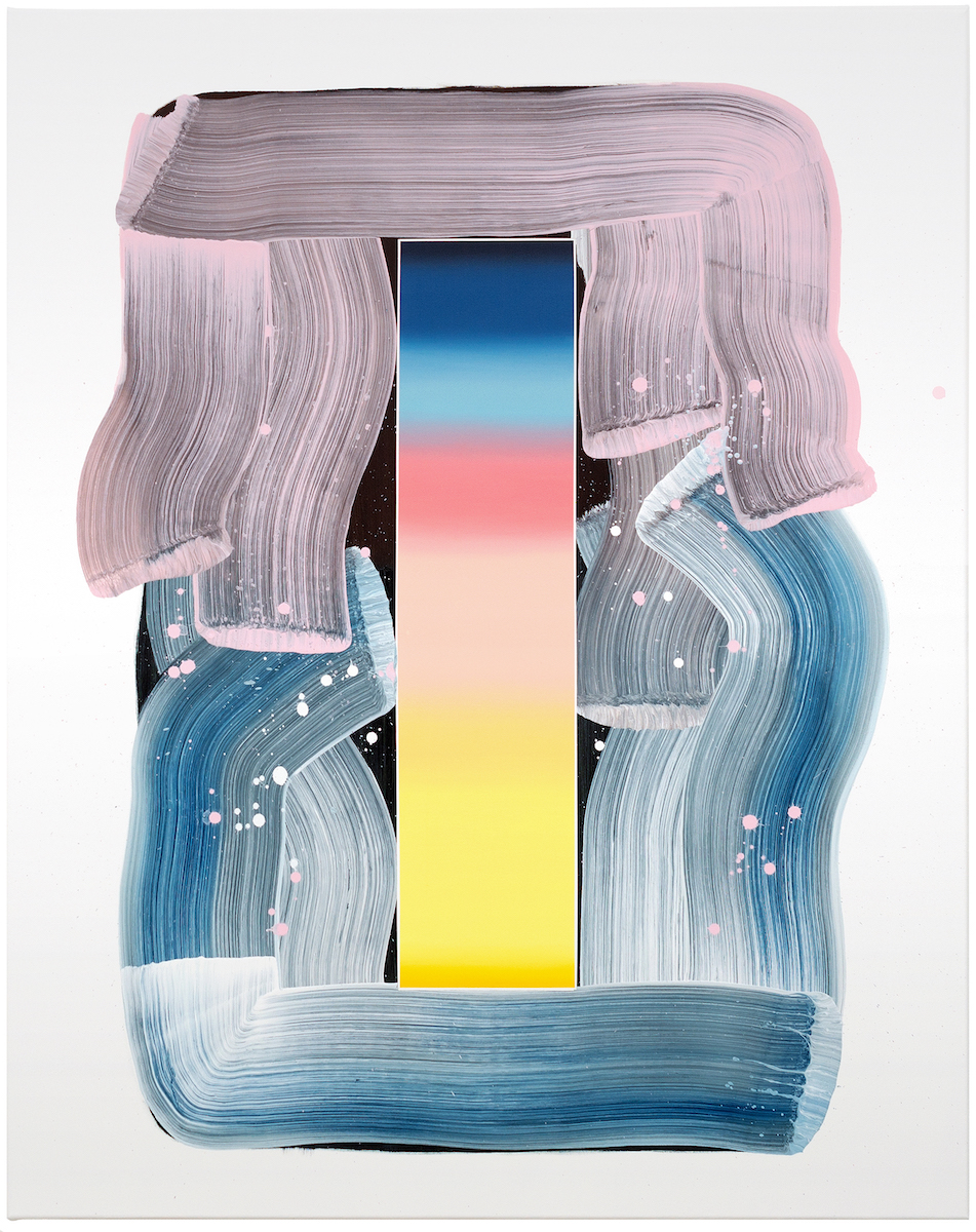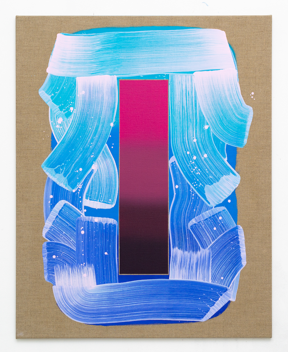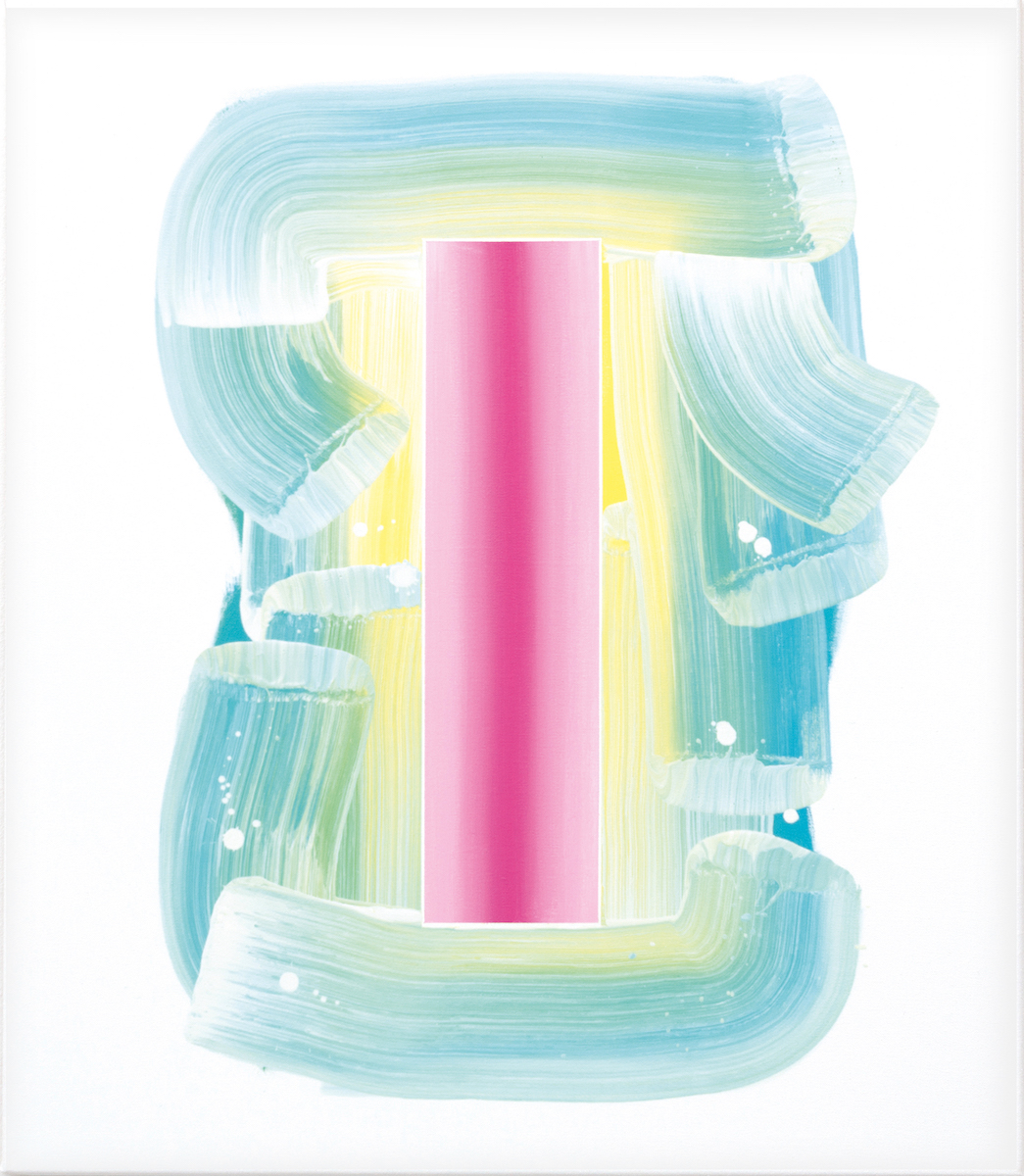 Painting as a science, that is, minus everything that could be interpreted into it. Nothing representational, nothing that could trigger associations with the audience, no metaphysics, but full control. Only form and color and light (relationships). Painting as an experimental arrangement. Strictly according to a once fixed concept: in the center a sharply defined upright bar, all around broad emphatically executed brushstrokes. The sober surrounded by the gestural; the prudent next to the impulsive. The timeless meets the fleeting and enters into a lasting bond. A moment becomes eternity, opening the possibility to investigate how the two antagonists correspond. Painting under laboratory conditions.