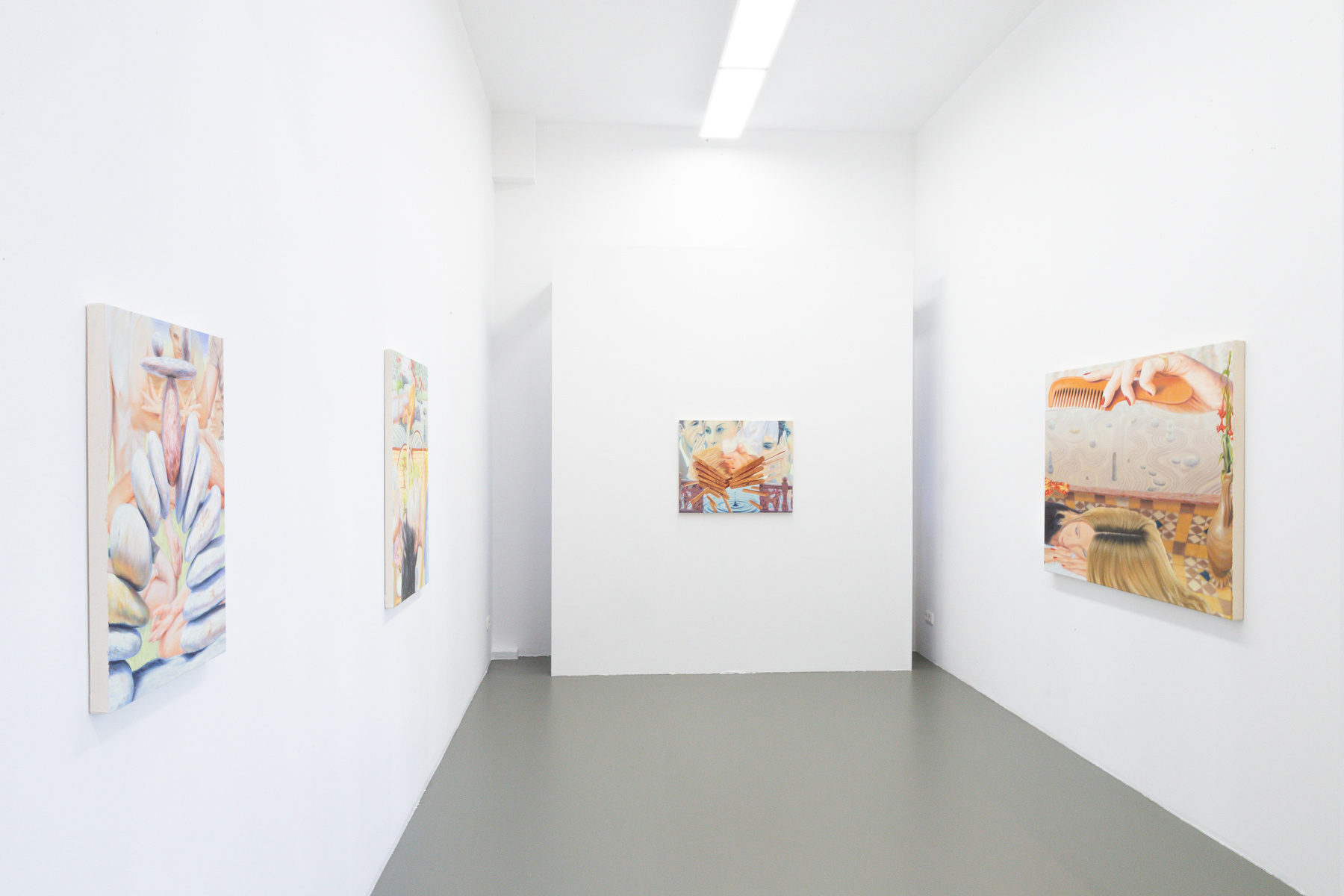Thorday, who came into contact with the romanticization of a time that idealized the Austro-Hungarian Empire through her Hungarian roots on her father's side, already processed similar tendencies in her studies abroad in London (Brexit 2019), in which she captures the mythical, fantastic threshold and peak moments in her process of overcoming disappointment. Consider, for example, “Cum grano salis”, in which a comb pauses in a swing over a head, also reflecting the aspects of her work that playfully address problematic aspects of the flow of expectations. This allows her to take people's underlying, genuine insecurity seriously, or as she says: “To paint the fears beautifully into the pictures.”