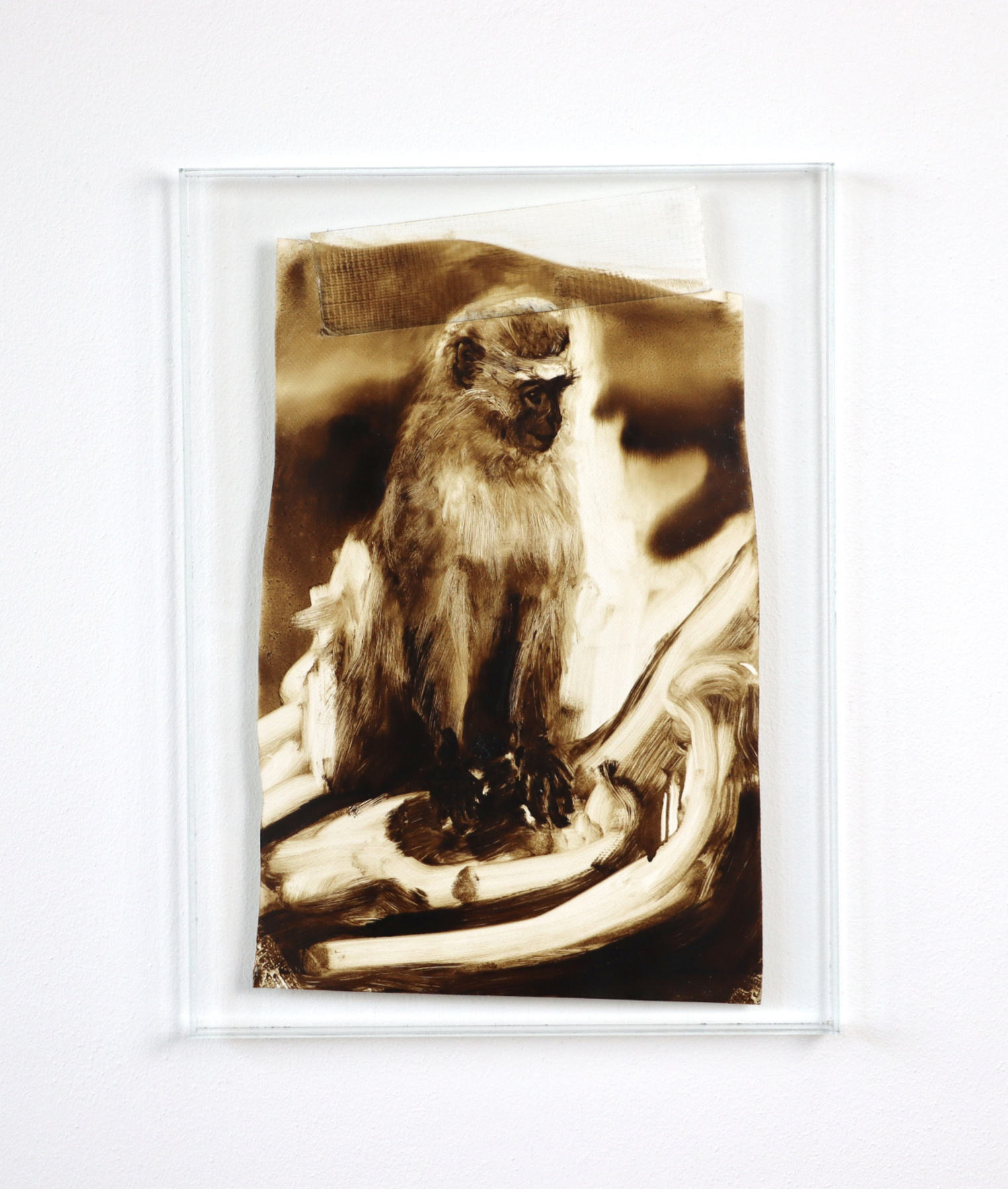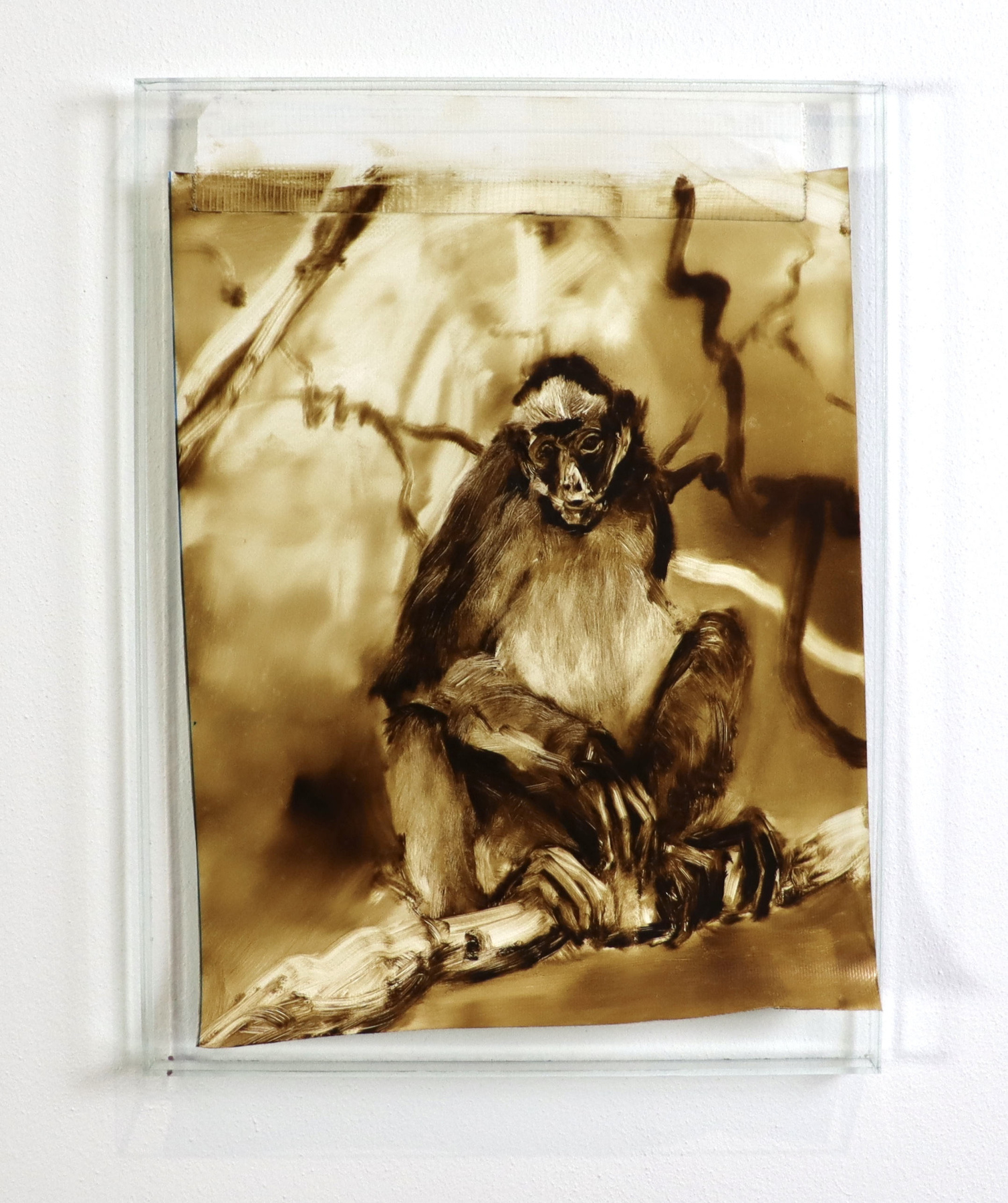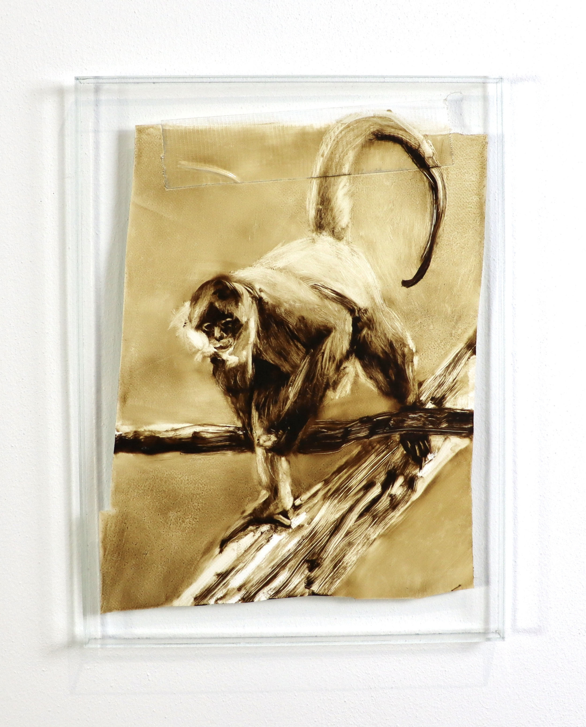 In Lab we show new works by Sebastian Maas, who presents his unusual technique, painting on tarpaulin, in glass boxes. His new series portrays different species of monkeys. These have been tracked down, observed, described, studied, classified and catalogued by humans. Everything needs its order - or also known as pigeonholing. People are looking for the typical. If one translates this into art, one encounters contradiction in the portrait. Here, only the individual and the capturing of his unique persona counts. Sebastian Maas combines these two human characteristics, typifying and the urge for individuality, and translates them into painting. His goal is to portray each monkey, as the only representative of its species, and thus to unite group and individual.