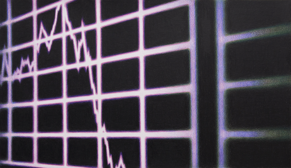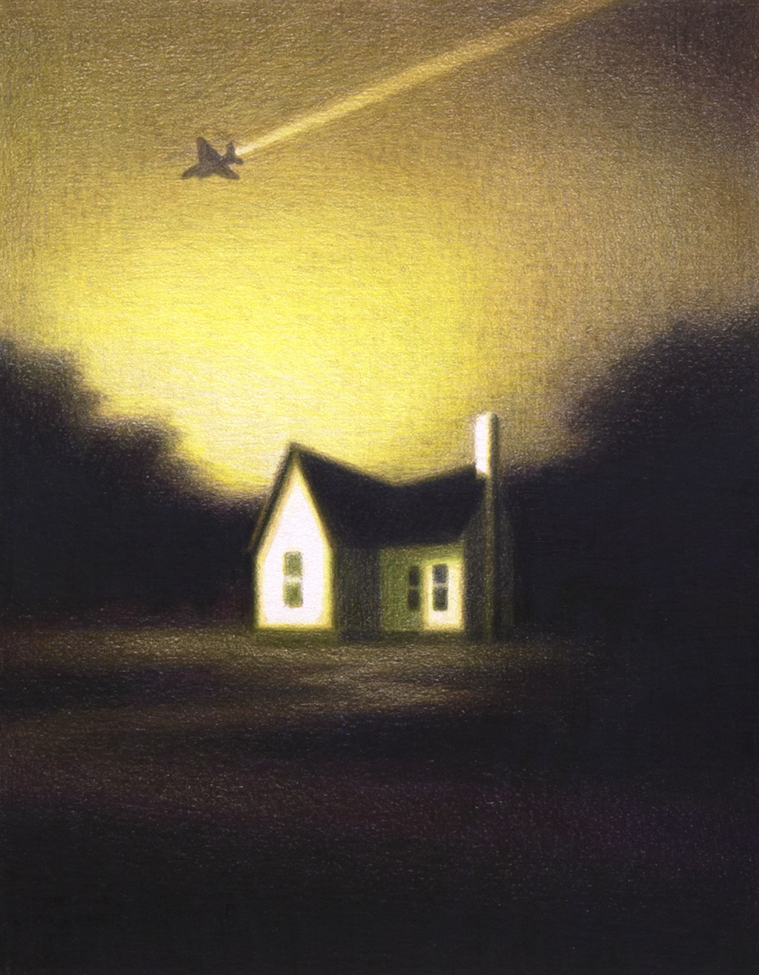 Steffen Kern continues the process. Using a meticulous technique of ink, colored crayon and watercolor on paper, he paints and draws places and objects he is familiar with at second and third hand, transforming their banality into magic: The deserted room entitled “Meeting” appears to consist solely of light and shadow. The “House” discernible as a dark silhouette against a night blue sky becomes a protective space due to its warmly illuminated windows. The “Red Chair” shines in glamor in front of a purple curtain. “Porch and Two Windows” is irritating because of the mysterious light reflections. All the forms appear gentle and soft, their contours blurred in the darkness. One senses that the artist’s gaze harks back to a time before television. Georges Seurat’s shadow figures emerge from the past, from an epoch when photography was in its beginnings.
