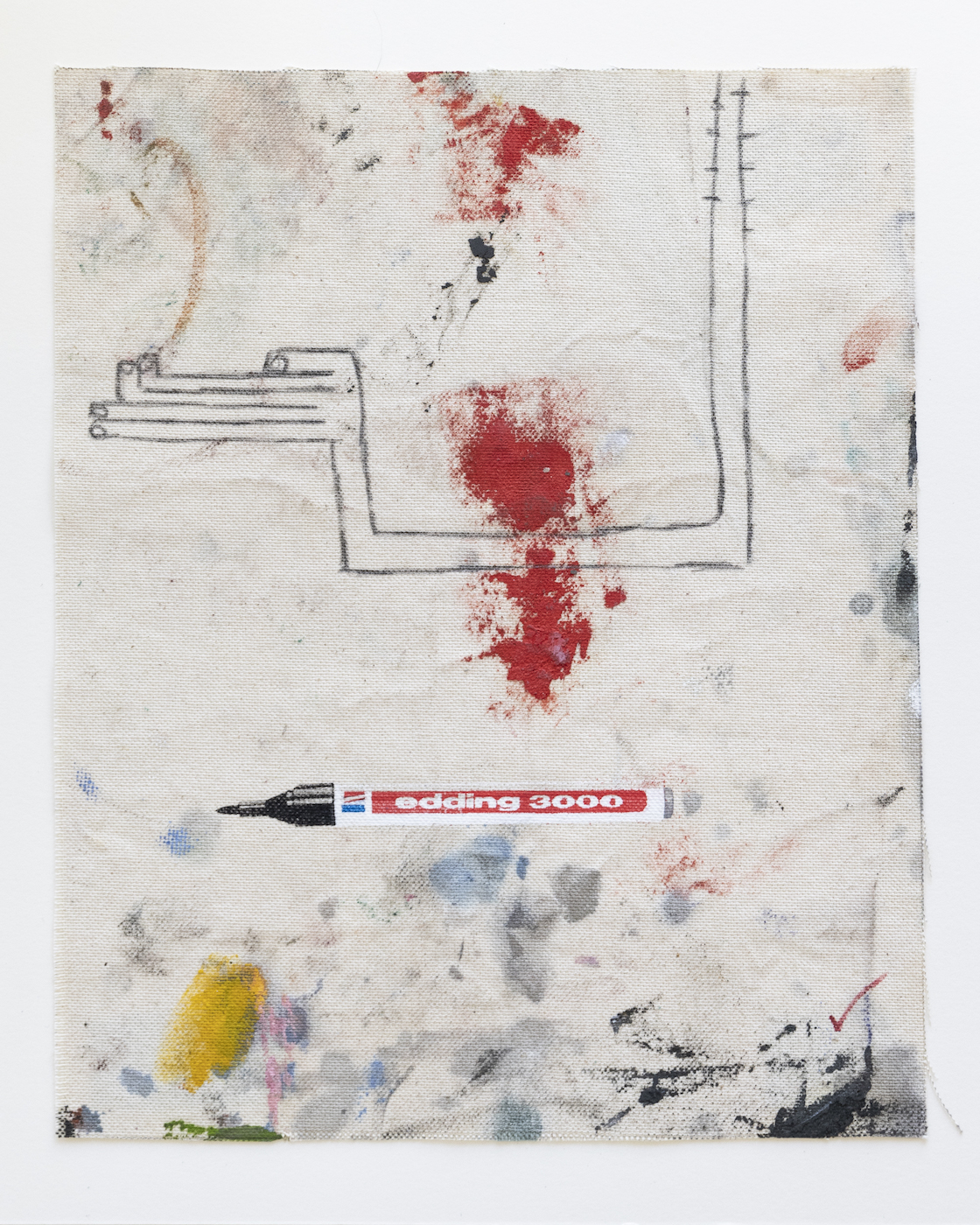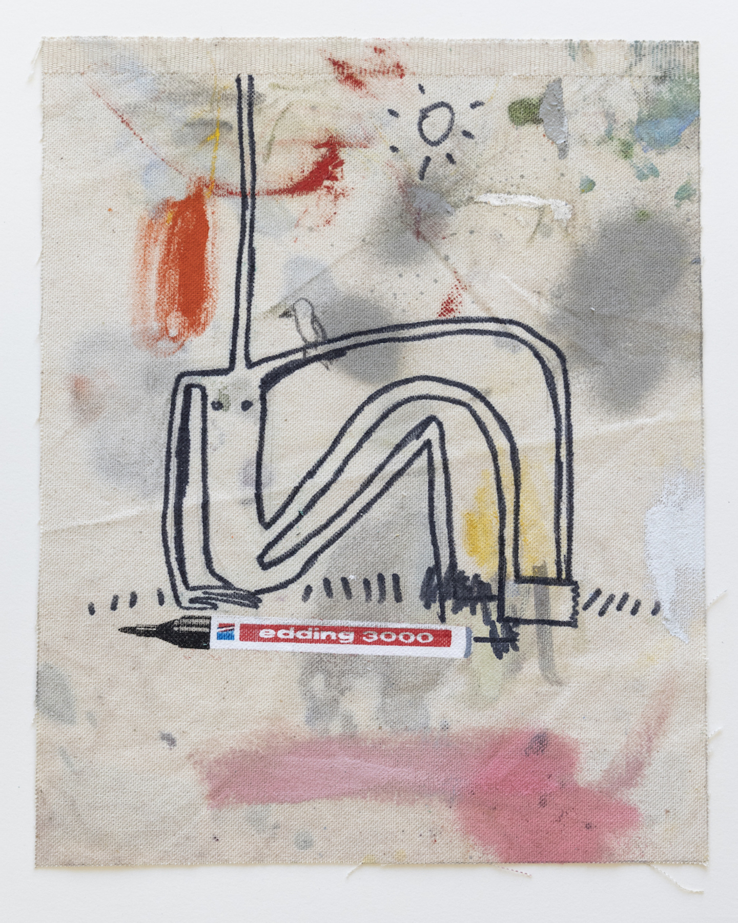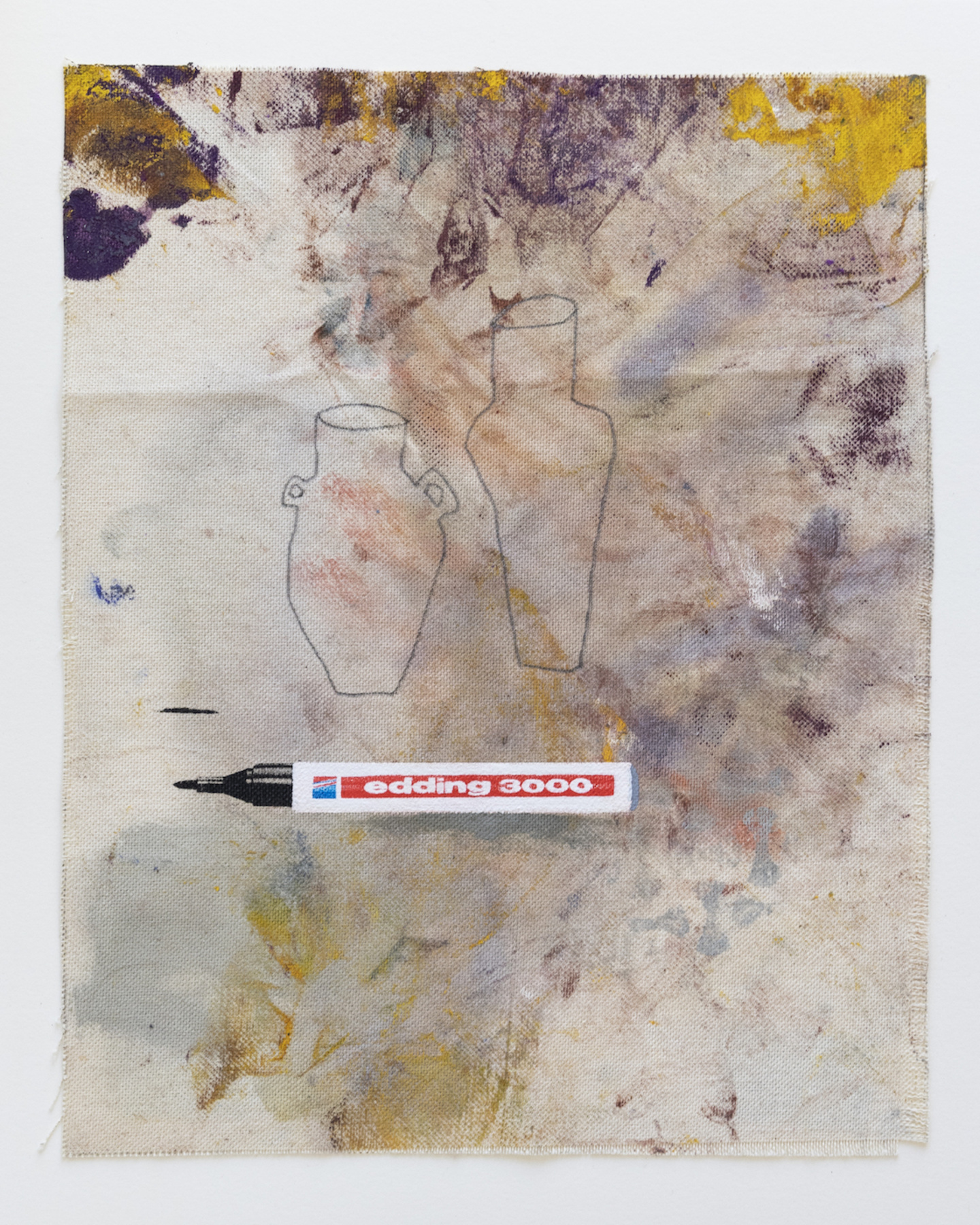 Sophie Ullrich nutzt für ihre Edition Stoffstücke, die beim Bauen der Leinwände abfallen. Auf den sogenannten Malerlappen werden die Pinsel abgestrichen oder Farbkombinationen ausprobiert, die Ableger ihrer Malerei sammelt und zieht sie als Skizzen immer wieder für Ideen heran. Der Farbauftrag ist passiv im Gegensatz zur aktiven Malerei auf den eigentlichen Leinwänden. Der Edding, ein immer wiederkehrendes Motiv in ihren Arbeiten, kommt mittels Siebdruck ebenfalls als indirekter Farbauftrag dazu. Die narrative Zeichnung wird individuell aufgetragen und macht jede Arbeit zum Unikat. Die Edition spiegelt ihre Schnittstelle zwischen Narration, abstrakten Bildelementen und schematischen Hintergründen wider.