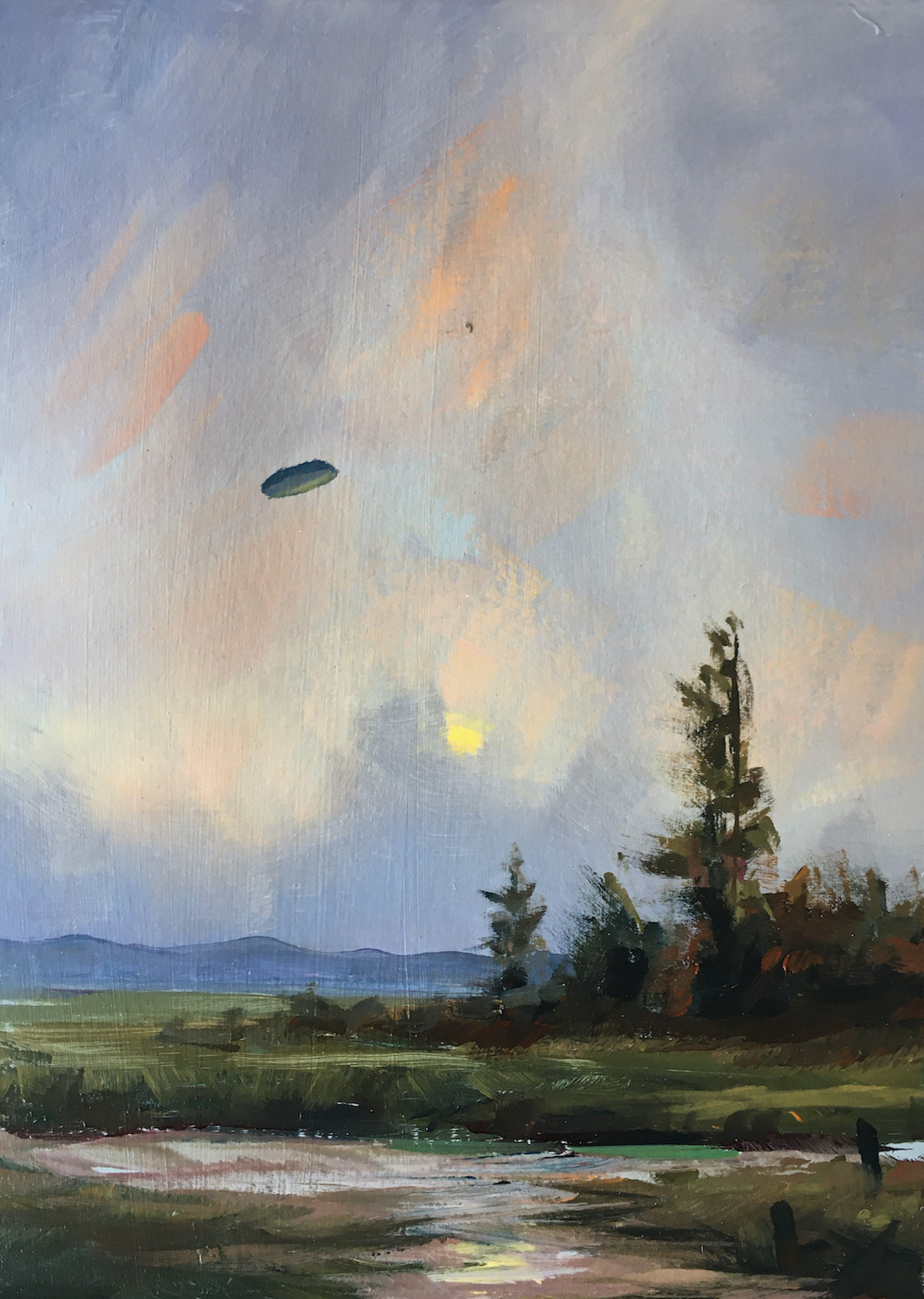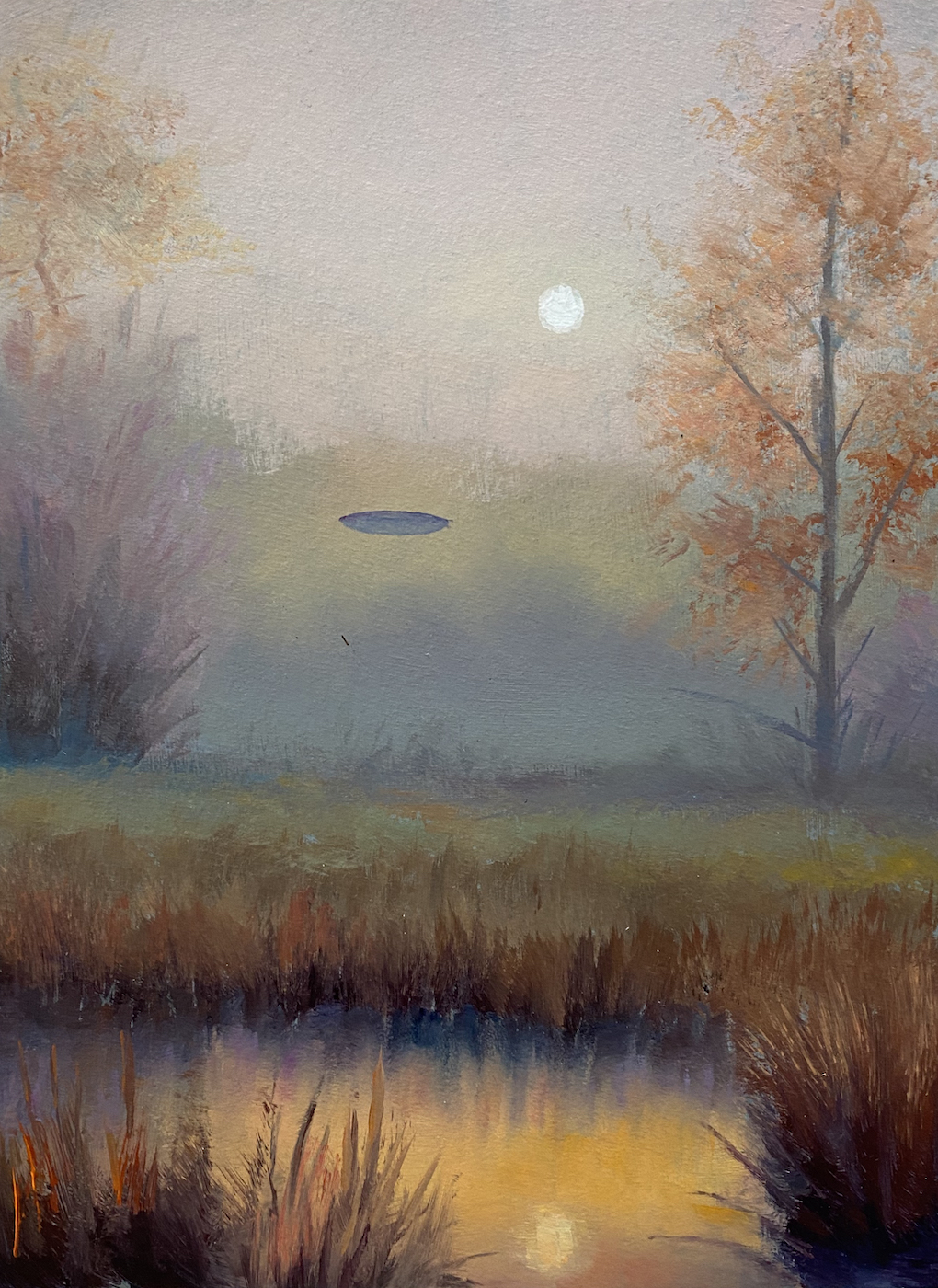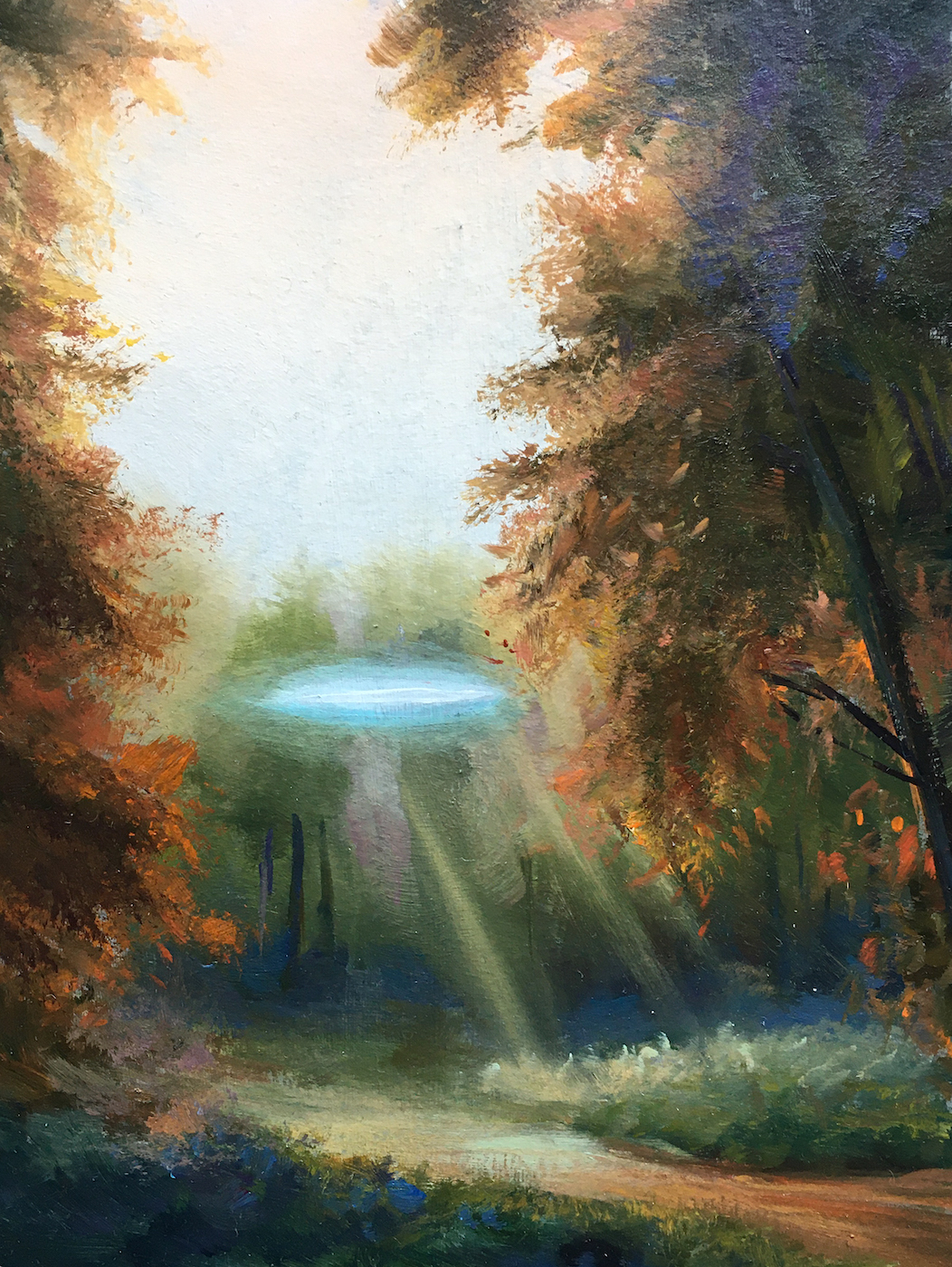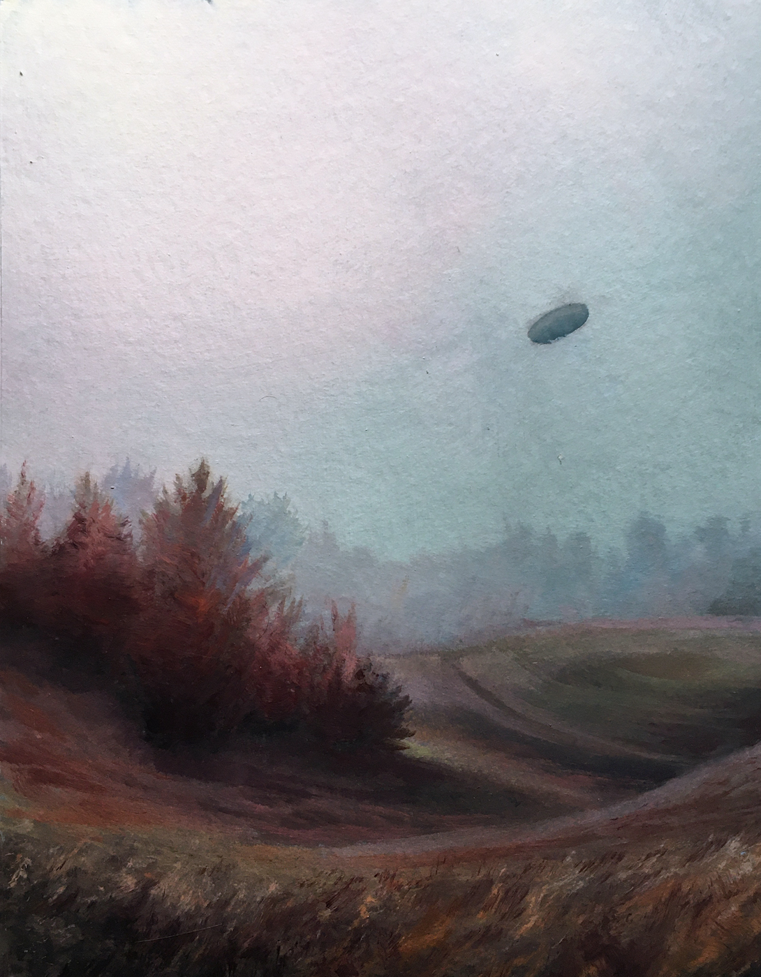 Seit Jahrzehnten sind Ufo-Sichtungen ein fester Bestandteil der Popkultur und faszinieren Menschen weltweit. Unabhängig davon, ob Abbildungen von Ufo-Sichtungen echt sind oder nicht, befeuern sie die Fantasie der Menschen und lassen uns darüber nachdenken, ob wir allein sind im Universum. Gerade in Zeiten von Verschwörungsmythen und Fake-News kann die Ufo-Sichtung als Klassiker unter eben jenen Narrativen gelten, die auf dem schmalen Grat zwischen Wissenschaft und Glauben balancieren. In seiner Serie I want to believe spürt Kersting diesem popkulturellen Phänomen nach, indem er den eigentlich fotografischen Abbildungen der Ufos ihren Nimbus als Beweisstück nimmt und Sie in Malerei übersetzt. So wird der Augenmerk auf ihren ästhetischen Gehalt als Landschaftsbild mit postmodern-ironischem Unterton gelegt.