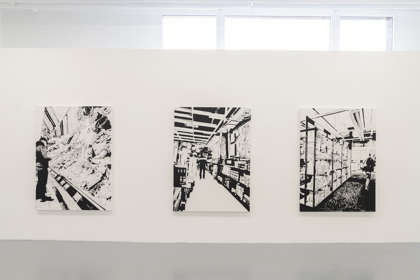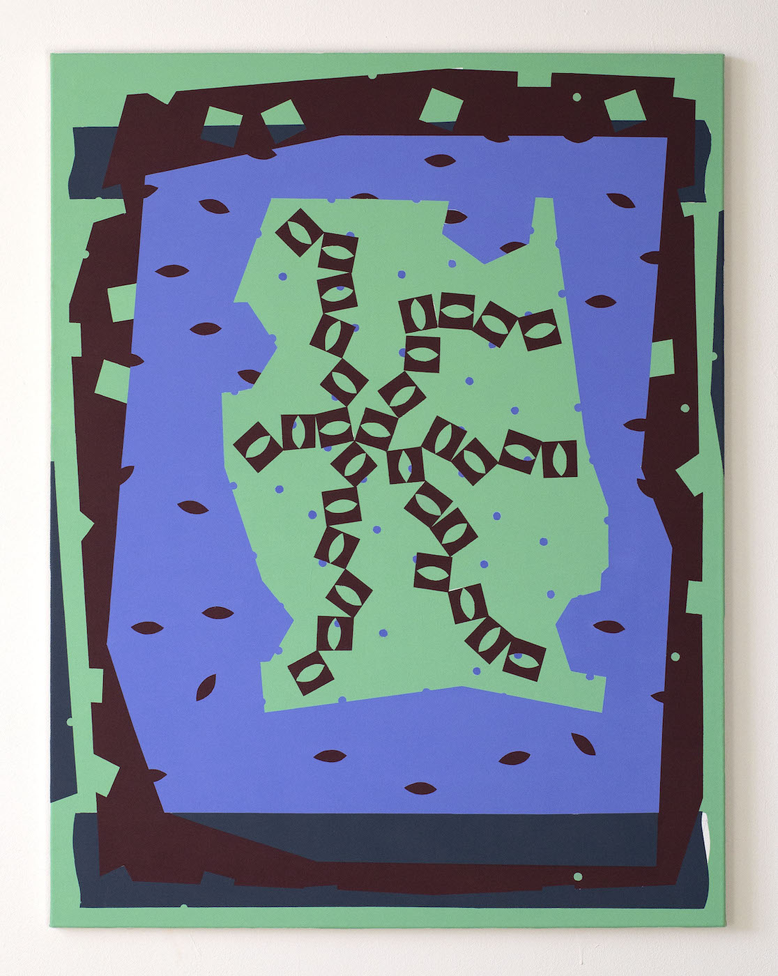 Die Arbeiten von Blanka Gyori sind wie Collagen, die aus farbigen Papieren ausgeschnitten sind: Flächen, die durch strenge Linien getrennt sind. Als Ausgangspunkt dienen ihr spontane, sehr einfache Zeichnungen, und viele Skizzen, sowohl manuell als auch digital. Wenn sie anfängt zu malen, sind die Zeichnung und die Umrisse der Formen festgelegt. Während des Malens konzentriert sie sich auf die Farben, Schnitte, Bewegungen. Sie sind angehalten, eingefroren, als ob ein Moment in einem dynamischen Prozess festgehalten wird. Sie sprechen auf spielerische Art und Weise über Gewalt und vermitteln Hoffnungslosigkeit mit dem Einsatz von Humor. Absurdität offenbart sich, wenn wir uns dem Wesen der Dinge nähern.