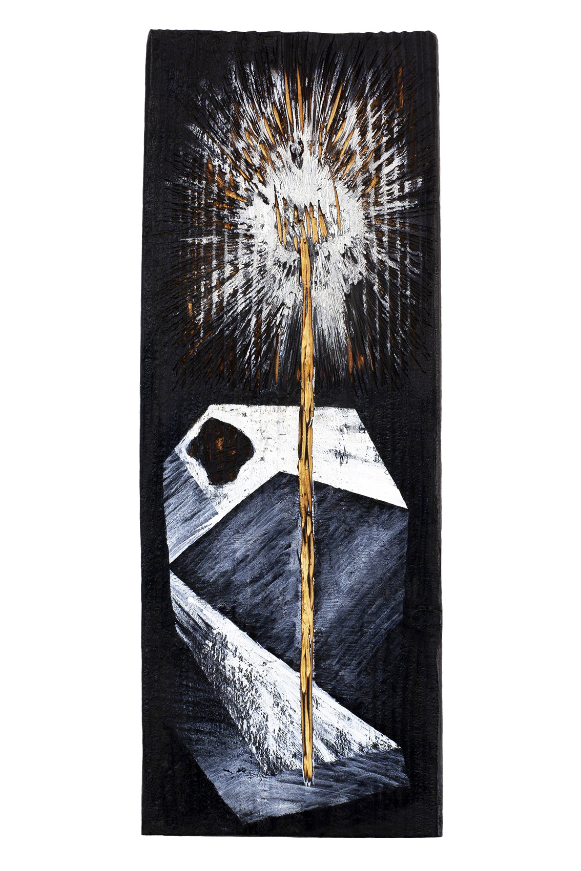 Den klaren Objektcharakter erhalten die Werke durch ihre starke Materialität. Denn Lena Schmidt arbeitet mit Holz und fügt sich demnach in eine geschichtsträchtige skulpturale Tradition ein. Und dennoch bricht sie mit dieser, indem sie nicht nur den Aspekt des Natürlichen, sondern vor allem dessen Widerspruch zum Industriellen betont, in dessen Kontext ihr Material verwendet wird. Es ist das ausgediente, zurückgelassene Abfallprodukt der Industriebrachen: Pfeiler, Paletten und Kisten. Jedes dieser Unikate trägt die Spuren seiner ursprünglichen Herkunft in sich. Die Folgen des Zersetzungsprozesses, ob Korrosion, Witterung oder farbliche Prägung durch Sonne, sind in das Gedächtnis des Holzes geradezu eingraviert. Auf dieser Oberfläche bilden Schmidts gezeichneten und geritzten Motive die Geschichte des Ortes ab, deren Teil das Holz selbst ist.