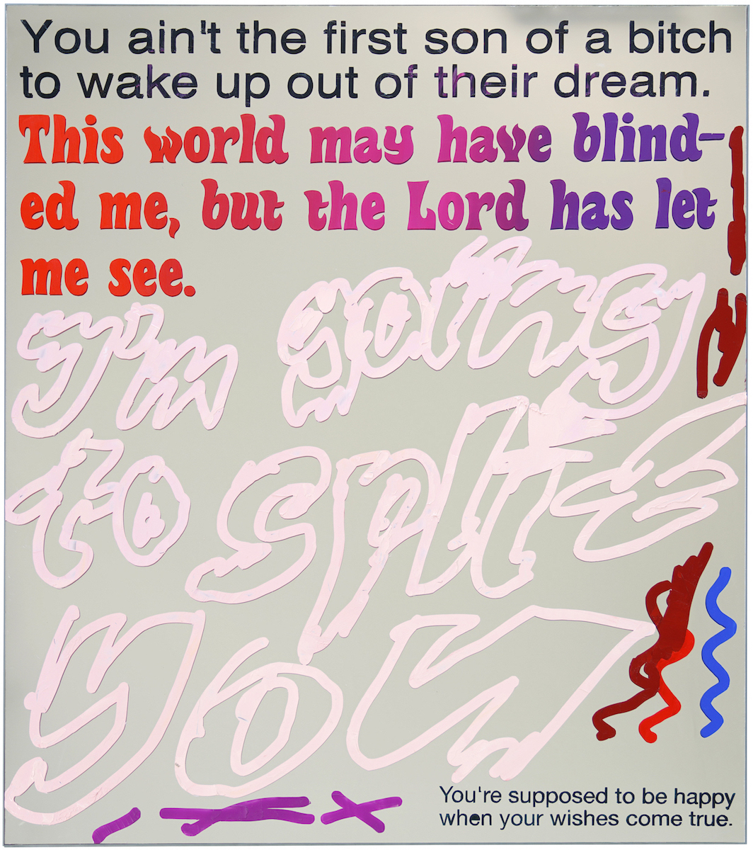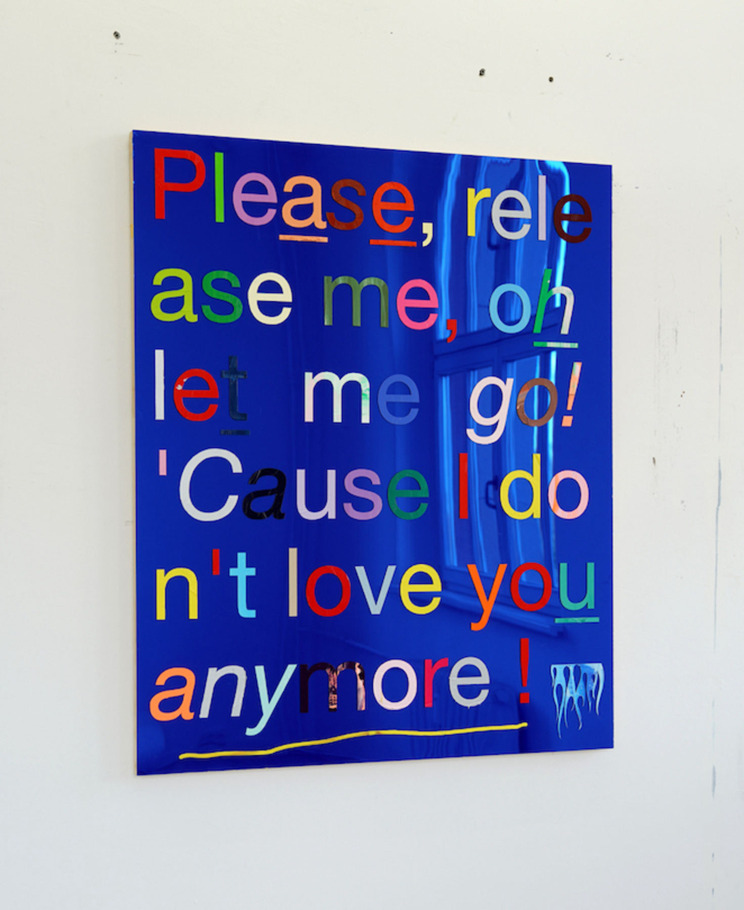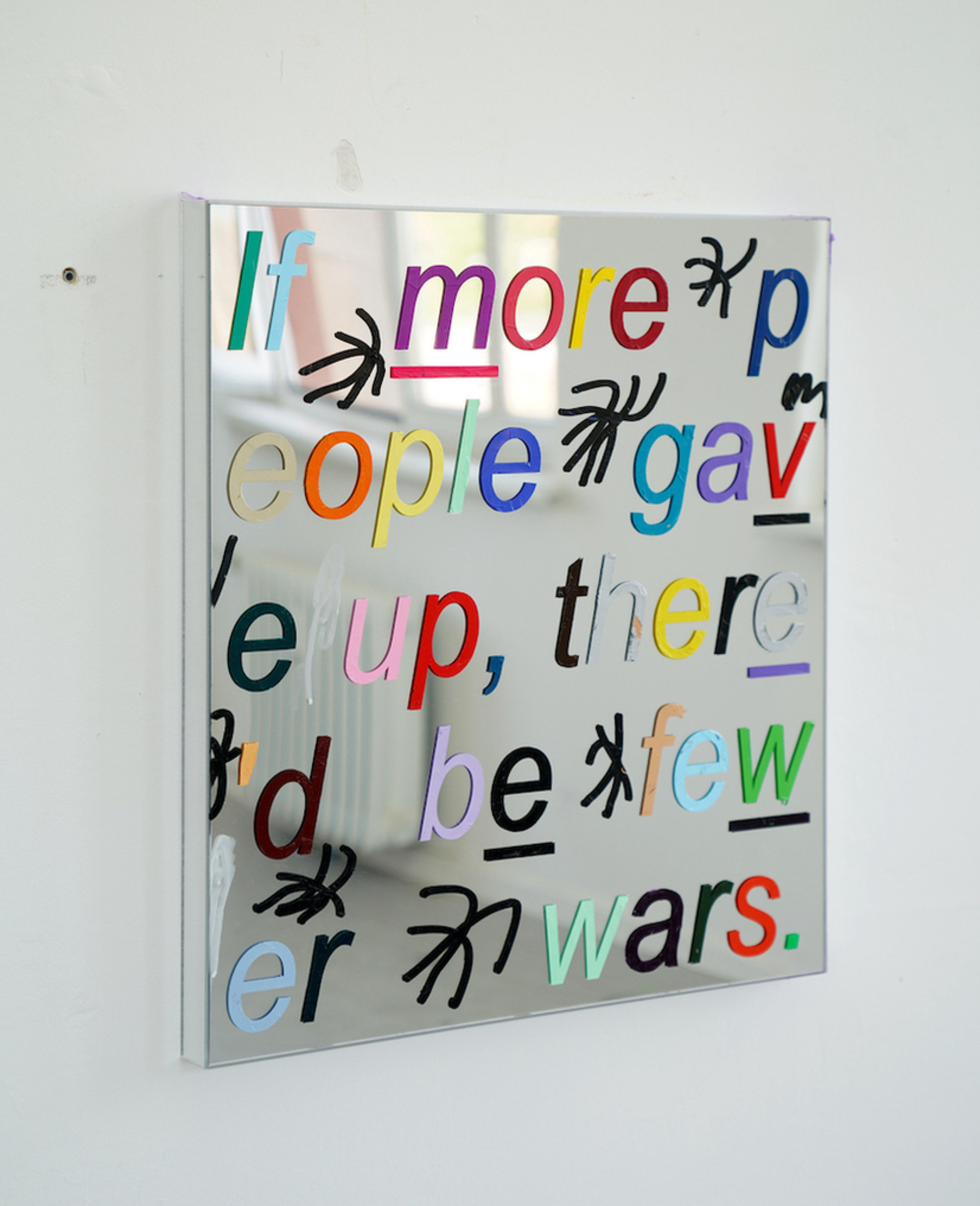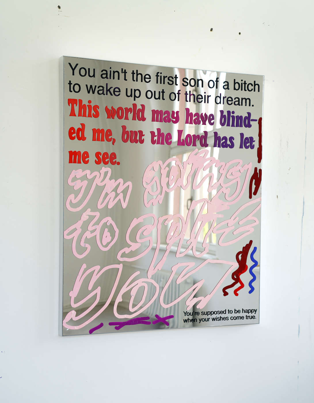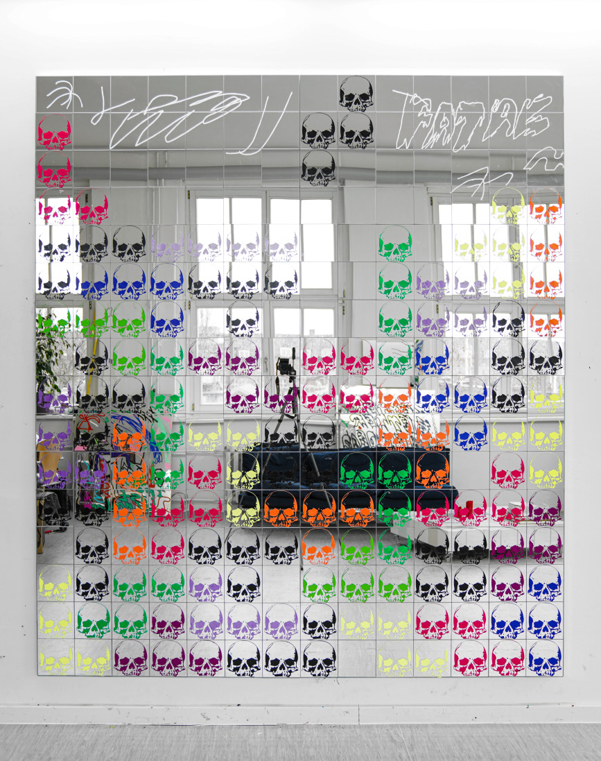 In seiner Einzelausstellung beschäftigt sich Lukas Glinkowski ausschließlich mit dem Spiegel als Material und Projektionsfläche. Präsentiert wird ein visuelles Mash-up: plakative Zitate aus Musik, Kunstgeschichte, Comics und dem urbanen Raum finden sich auf dem ungewöhnlichen Bildträger wieder. Bei oberflächlicher Betrachtung könnten die grellen Farben im Kontrast mit dem glatten Material an die Überreste einer Berliner Party-Nacht erinnern. Der intensive Blick in den Spiegel und auf die Motive konfrontiert die Betrachtenden hingegen mit sich selbst und den Fragen des Lebens, die der Künstler in Wortfetzen und Symbolen auf dem reflektierenden Malgrund andeutet.