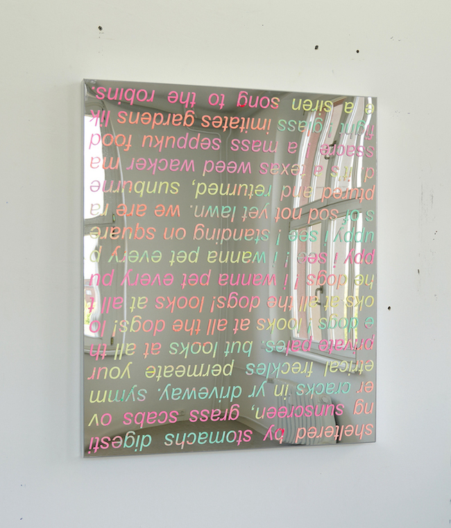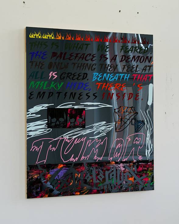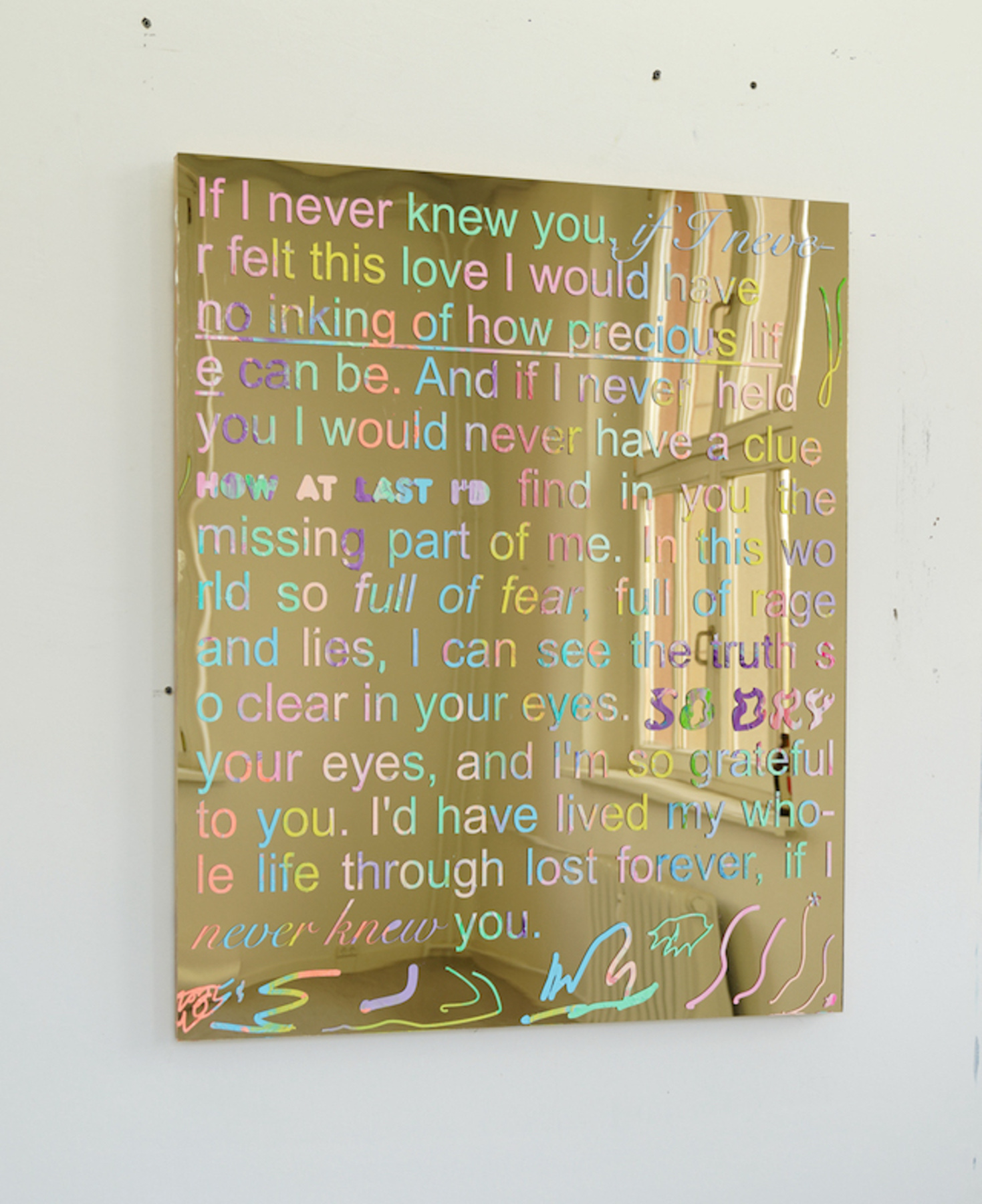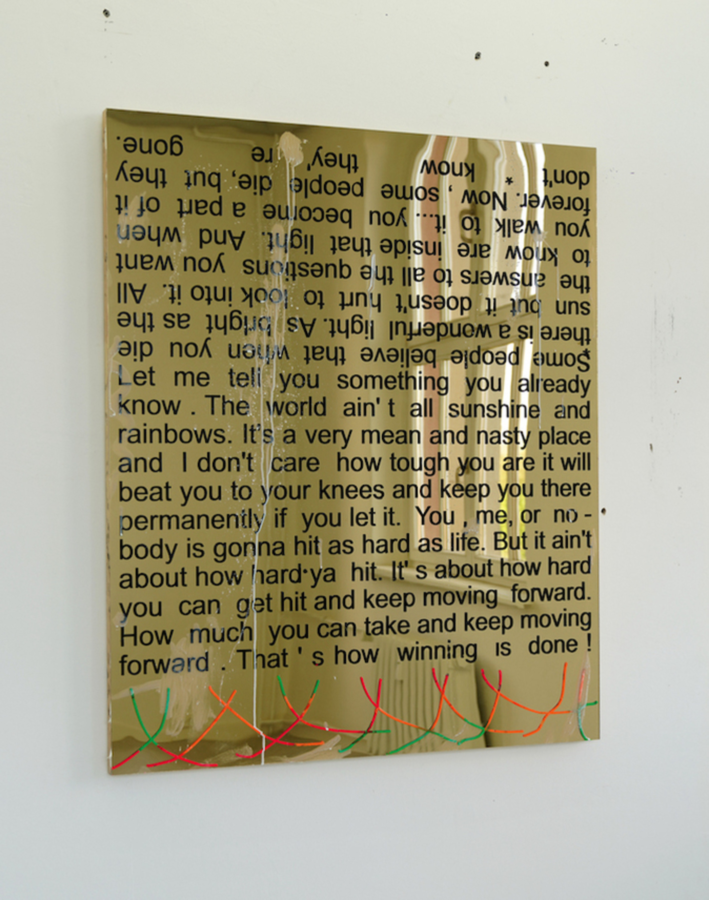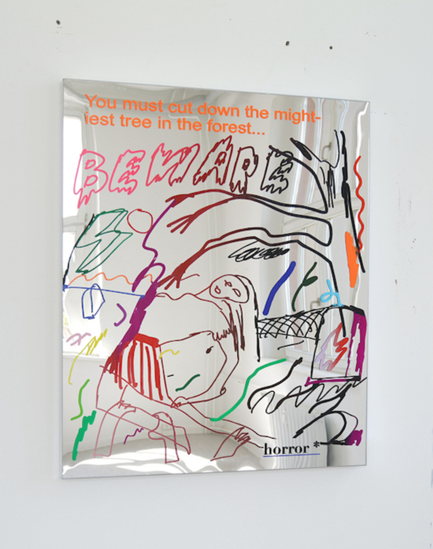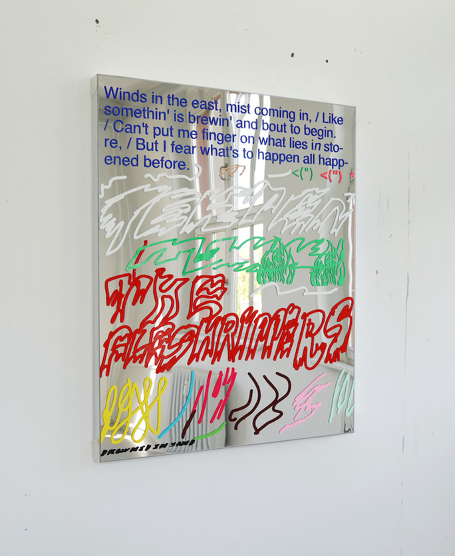 In seiner Einzelausstellung beschäftigt sich Lukas Glinkowski ausschließlich mit dem Spiegel als Material und Projektionsfläche. Präsentiert wird ein visuelles Mash-up: plakative Zitate aus Musik, Kunstgeschichte, Comics und dem urbanen Raum finden sich auf dem ungewöhnlichen Bildträger wieder. Bei oberflächlicher Betrachtung könnten die grellen Farben im Kontrast mit dem glatten Material an die Überreste einer Berliner Party-Nacht erinnern. Der intensive Blick in den Spiegel und auf die Motive konfrontiert die Betrachtenden hingegen mit sich selbst und den Fragen des Lebens, die der Künstler in Wortfetzen und Symbolen auf dem reflektierenden Malgrund andeutet.