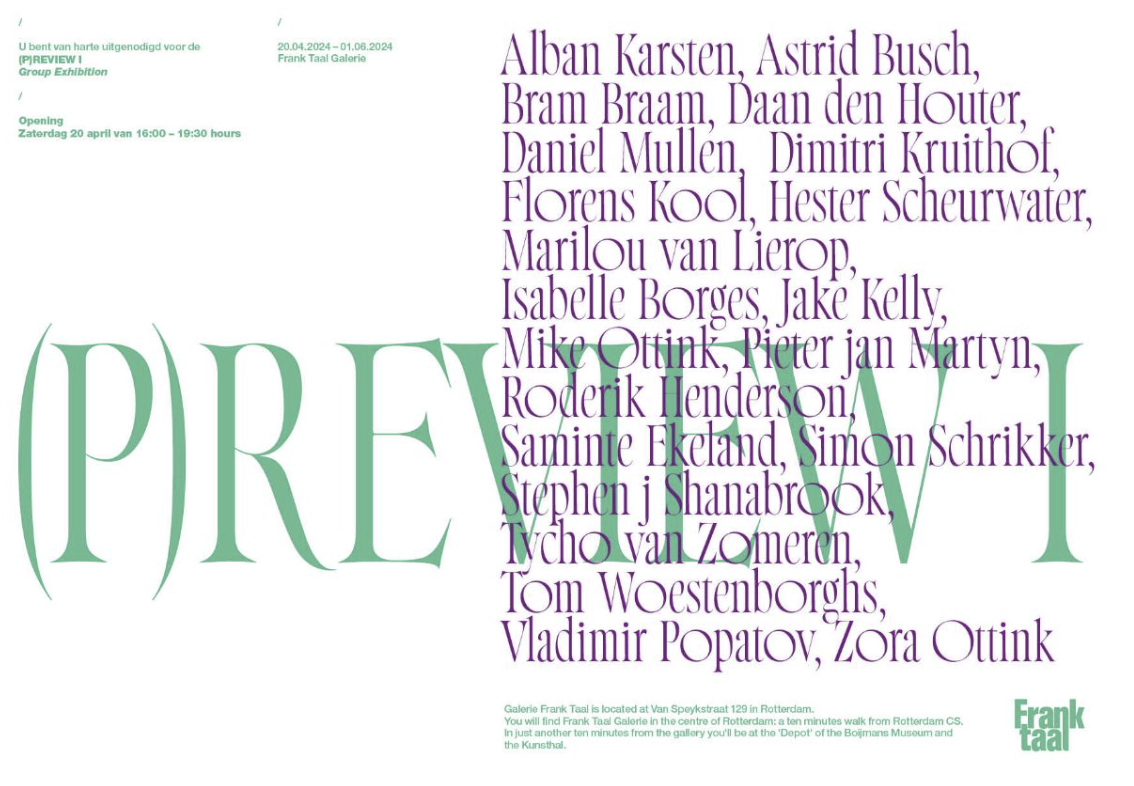 Teilnehmende Künstler:innen: Isabelle Borges, Bram Braam, Astrid Busch, Saminte Ekeland, Roderik Henderson, Daan den Houter, Alban Karsten, Florens Kool, Dimitri Kruithof, Marilou van Lierop, Pieter jan Martyn, Daniel Mullen, Mike Ottink, Vladimir Potapov, Hester Scheurwater, Stephen j. Shanabrook, Tom Woestenborghs, Tycho van Zomeren