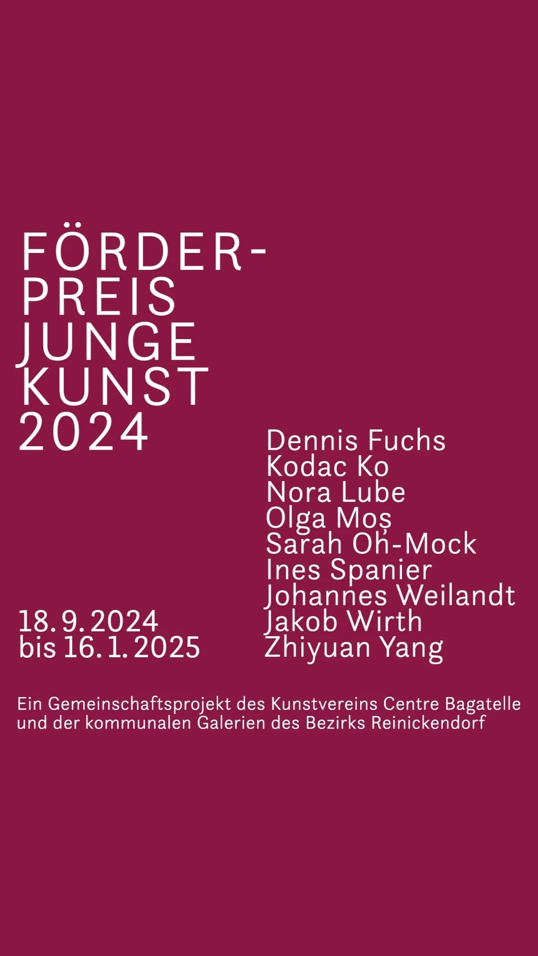 Teilnehmende Künstler:innen: Dennis Fuchs, Kodac Ko, Nora Lube, Olga Mos, Sarah Oh-Mock, Ines Spanier, Johannes Weilandt, Jakob Wirth, Zhiyuan Yang