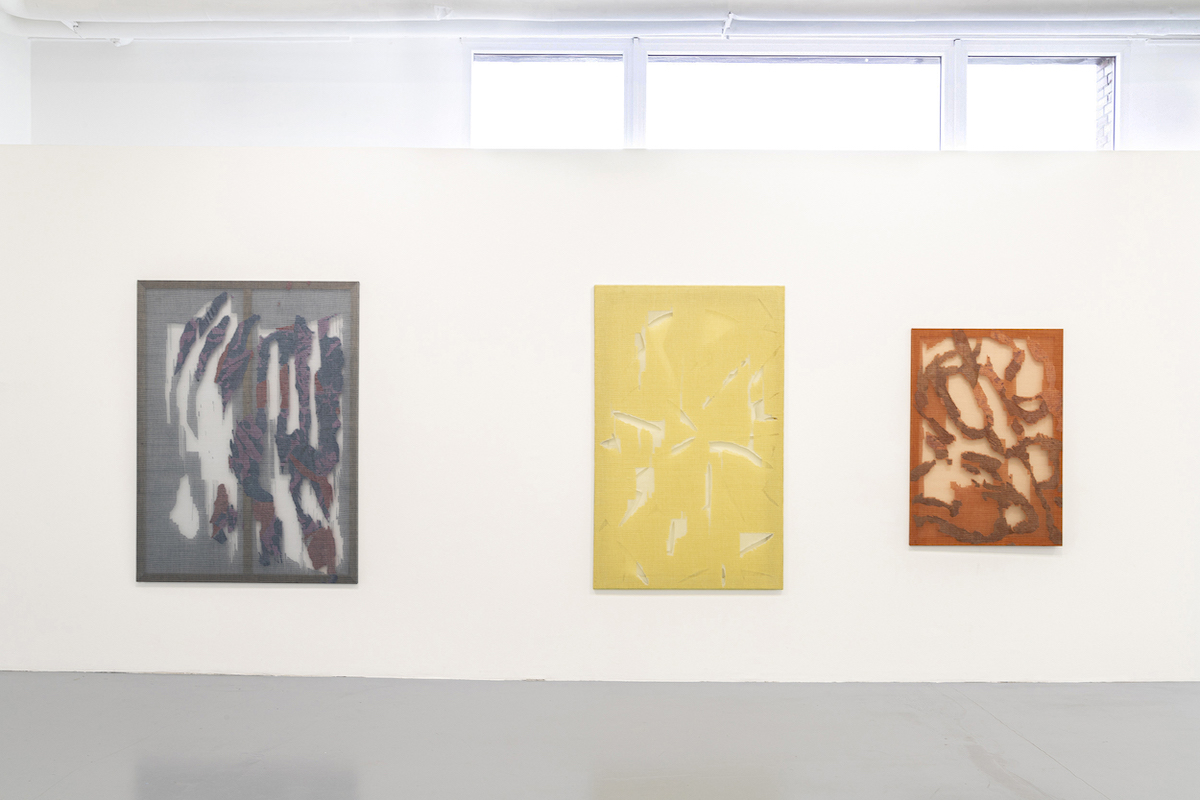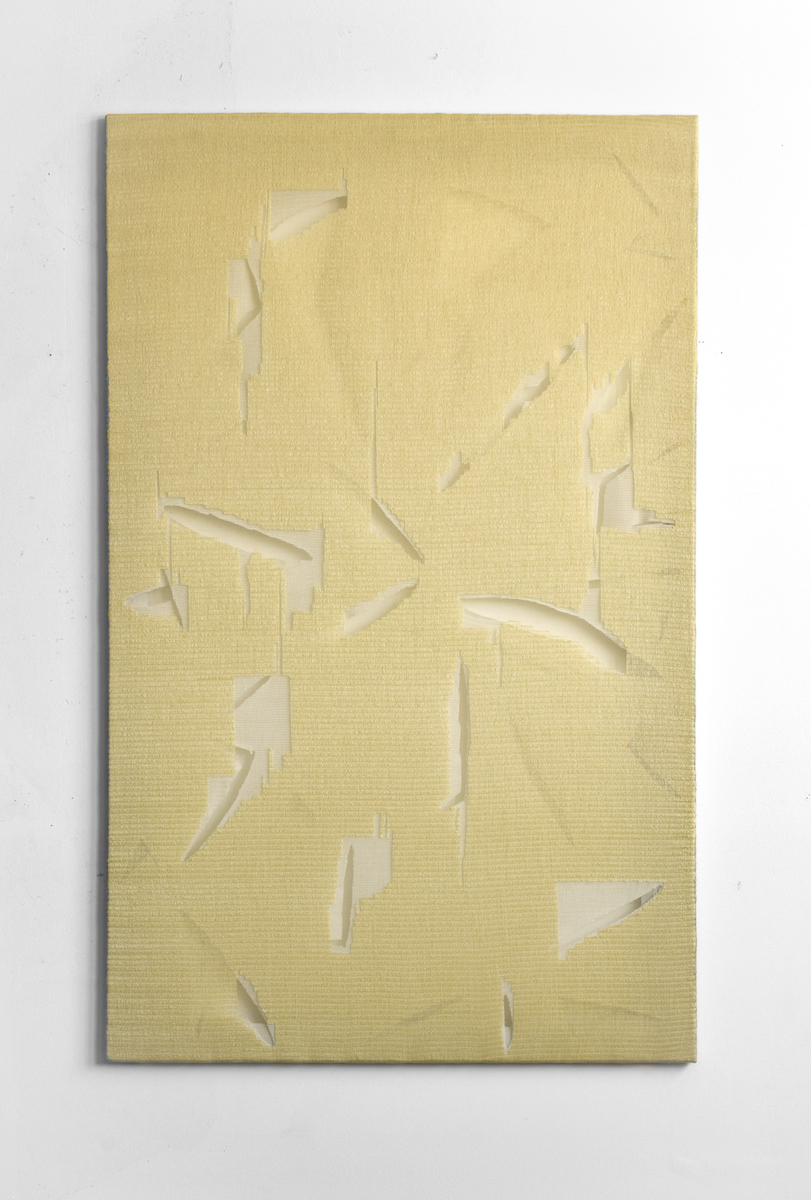 Close by, Close up, close... Nähe, sich nähern, nah dran sein, konfrontiert sein, eintauchen, entdecken, wahrnehmen. Olga Jakobs Arbeiten verlangen danach, ‚näher‘ zu kommen, sie zu studieren, ihre Struktur mit den Augen nachzufühlen, nachzuzeichnen. Ihre Werke fordern den Betrachter dazu auf, ihrer Materialität auf den Grund zu gehen, die einzelnen Materialien in den Arbeiten in ihrer Verflechtung zu erkennen, um als Ganzes über sie nachzusinnen und über sie zu sprechen, und auf diese Art neue ‚Fäden zu spannen’. Textilien, Stoffe, Papier, Farben sind die wichtigsten Protagonisten in Olga Jakobs Werken. Dabei handelt es sich fast ausschließlich um textile Materialien, mit denen jeder Mensch tagtäglich konfrontiert ist. Wir sind umgeben und eingehüllt von Textilien, mit einer Unmittelbarkeit, die für Jakob den Ausgangspunkt ihres künstlerischen Schaffens begründet. Reste industrieller Textilien, alte Werbeprospekte, in großer Masse ausgeworfene und oft in kürzester Zeit wieder als bedeutungslos erachtete Produkte unserer schnelllebigen Alltagskultur. Diese visuelle und textile Überflutung der aktuellen Konsumindustrie wird von Olga Jakob aufgegriffen, indem sie den Textilien mit einer neuen ästhetischen Wertschätzung gegenübertritt, sich mit diesen in eine kritische Auseinandersetzung über deren Ursprung begibt und schließlich einen neuen Kontext und eine andere Bedeutung für sie in ihren Bildwerken generiert. Raum, Zwischenraum, Räume eröffnen oder verschließen, Oberflächen, Rückseiten, Inhalt und Hülle, Vordergrund und Tiefendimension. Die Arbeiten vereinen in sich eine immense Spannbreite an visuellen Eindrücken und erforschen vielfältige plastische Neuinterpretationen des klassischen Bildes auf Keilrahmen. Gazestoffe, die von feinen eingewebten Textilfäden durchzogen sind, bilden eine der aktuellen Werkgruppen in den Arbeiten von Jakob. Je nach Farbigkeit und Bearbeitung und in hoher Abhängigkeit vom wechselnden Lichteinfall wirken diese großformatigen textilen Farbflächen fragil und sensibel oder expressiv, massiv und in sich dynamisch. Der Grundstoff wird von wellenartigen, glänzend changierenden Linien durchzogen. Sie winden sich an ‚offenen Fenstern‘ vorbei, die durch das Heraustrennen der eingewebten Faserstränge aus dem Gazestoff entstanden sind. Auf diese Weise entstehen Räume, die den Betrachter fast magisch anziehen und Fragen über das ‚Dahinter‘ oder ‚Dazwischen‘ aufwerfen. Die Arbeiten, in denen Jakob größere Flächen des transparenten Gazestoffs freilegt und auf diese Weise mit Raum- und Bilddimensionen spielt, erinnern an Rauminstallationen des US-amerikanischen Künstlers Robert W. Irwin. Die Werke lassen durch die Transparenz des Stoffes eine Illusion von Raum und Zwischenraum entstehen, für die die Gaze als eine Membran zwischen Schein und Wirklichkeit fungiert. Durch die Verwendung der unterschiedlichsten Materialien, Formate und Farbigkeit besitzen die Arbeiten der Künstlerin mal mehr einen installativen, einen Gemälde- oder einen plastischen, beinah bildhauerischen Charakter. Dies zeigt sich vor allem in der Werkgruppe der monochrom wirkenden Bildreliefs. Diese Reliefs arbeitet Jakob aus Stoffen heraus, die mit in Kleister eingeweichtem Seidenpapier aus recycelten Papieren überzogen sind. Das ‚Innere‘, das ‚Skelett‘ des jeweiliges Bildes wird wie von einer Haut durch die sensibel und fragil anmutende Papierschicht bedeckt, verhüllt, bewahrt und geschützt. Auch bei diesen Werken wird das Wesen der Arbeiten von Jakob deutlich, indem sie plastisch gewordene Fragen zu Materialität, Räumlichkeit und Alltagskultur an den Betrachter richten.